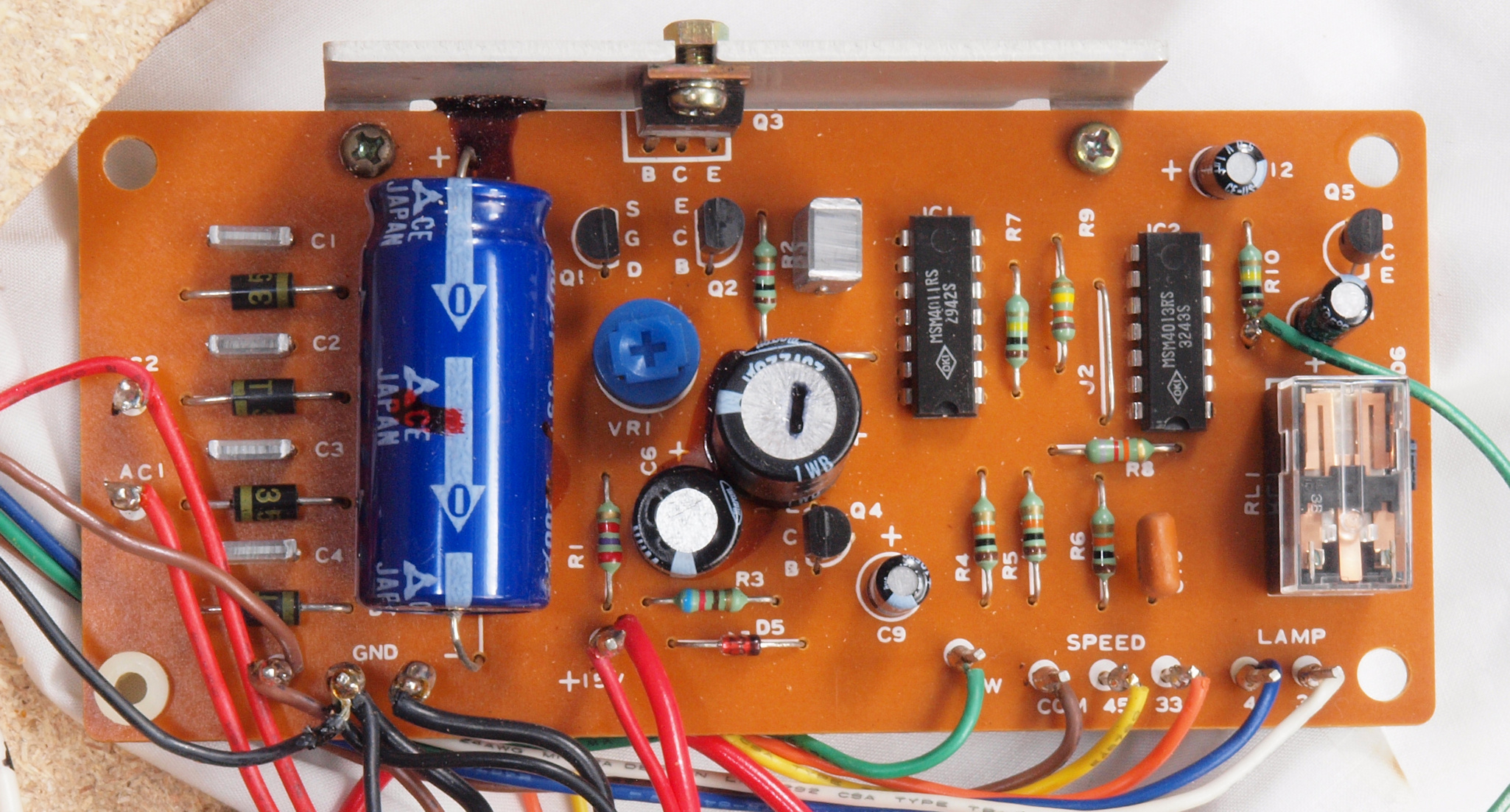 | C22. 修理後 電源・33/45切替基板。 半固定VR1個、電解コンデンサー6個、リレー1個交換 | ||||||||||||||||||||||||