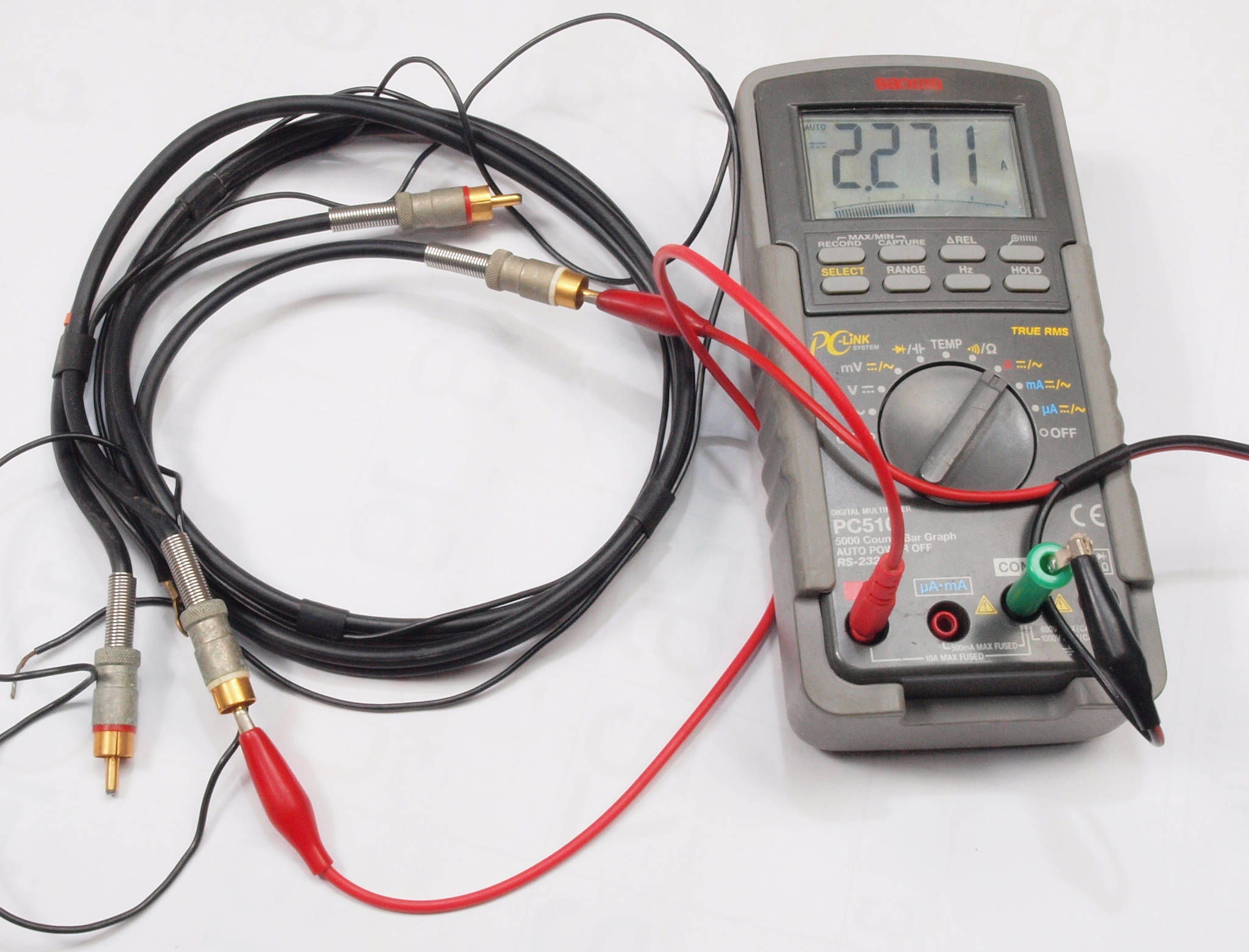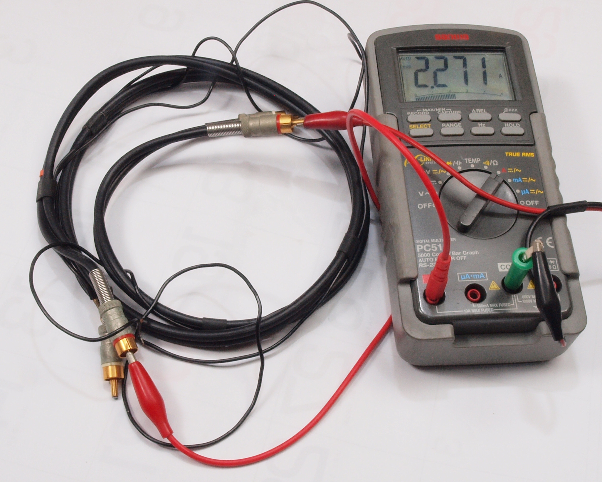 | C6. 修理(点検)中 RCAケーブル心線検査−R側。 2A位流し、劣化を見る。 |