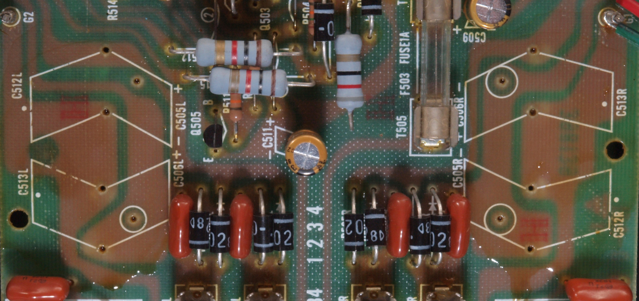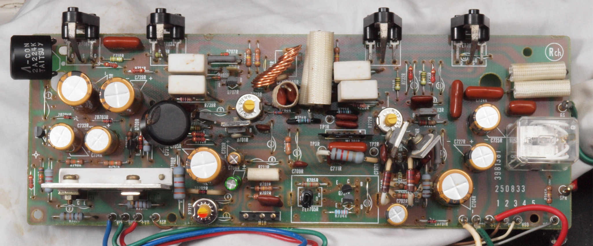 | C43. 修理中 RLモジュール裏。 TR(トランジスター)6個交換し、洗浄後軽くラッカーを吹く。 |