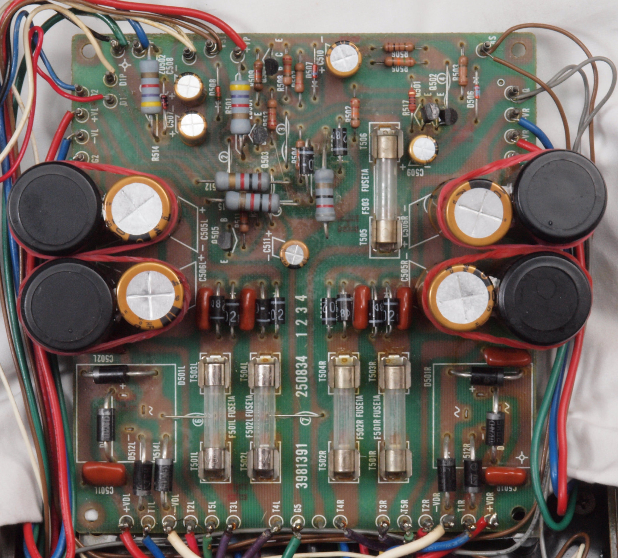 | C22. 修理後 L側ドライブ基板。 初段FET(電界効果トランジスター)、バランス/バイアス調整用半固定VR3個、SP接続リレー交換 ヒューズ入り抵抗全部、電解コンデンサー11個、TR(トランジスター)2個交換、モジュール修理交換部品は除く。 |
