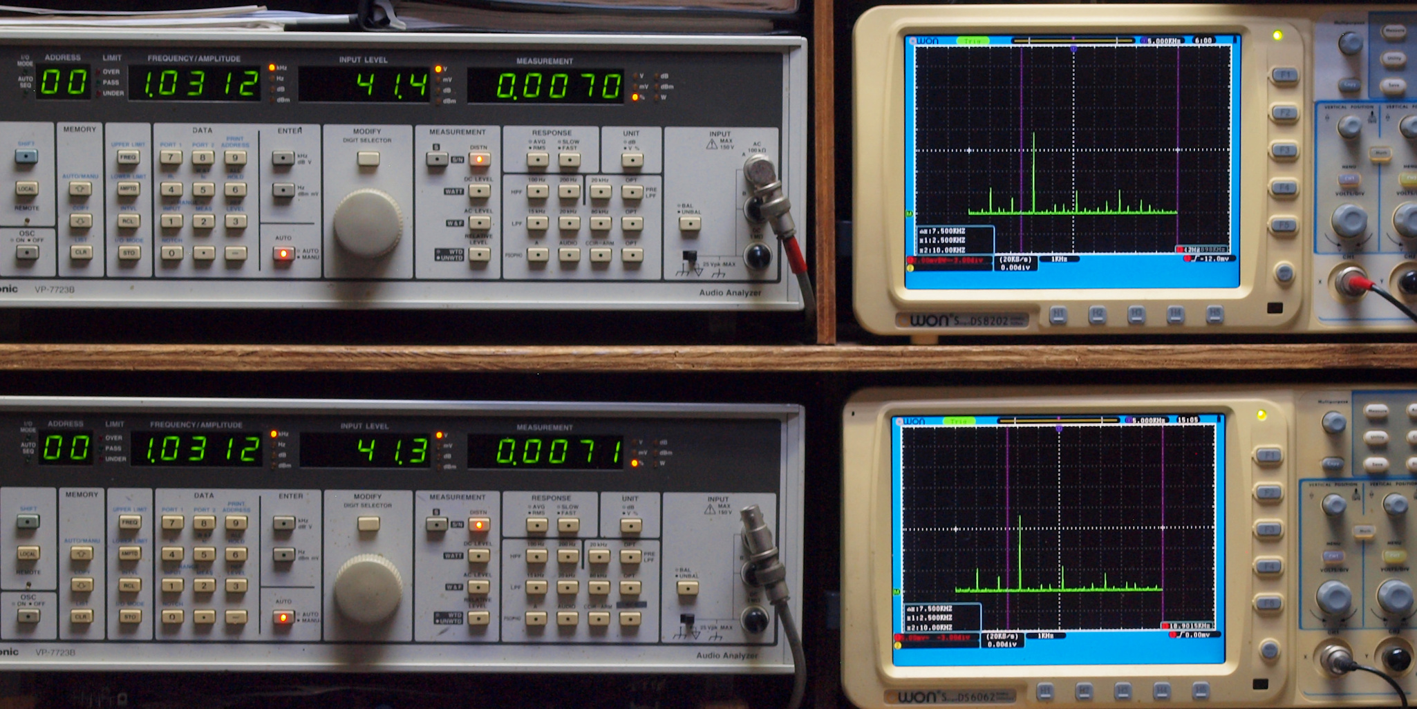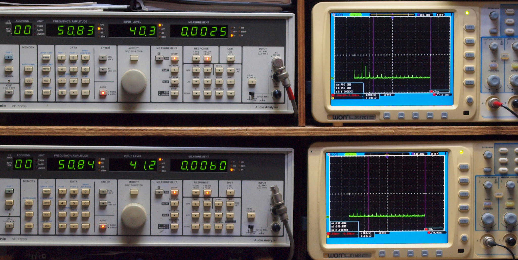 E. 測定・調整。 画像をクリックすると、大きく(横幅2050ドット)表示されます。 E1. 出力・歪み率測定・調整 「見方」。 上段中 右側SP出力を「Audio Analyzer Panasonic VP−7723B」により測定。 表示LED、 左端=メモリーNo、 中左=周波数測定、 中右=出力電圧測定、 右端=歪み率測定。 上段右端 VP−7723Bの基本波除去出力を「owon SDS8202(200MHZ)」で「FFT分析」表示。 下段中 左側SP出力を「Audio Analyzer Panasonic VP−7723B」により測定。 表示LED、 左端=メモリーNo、 中左=周波数測定、 中右=出力電圧測定、 右端=歪み率測定。 下段右端 VP−7723Bの基本波除去出力を「owon SDS6062(200MHZ)」で「FFT分析」表示。 下段左端 オーディオ発振器 VP−7201A より50Hz〜100kHzの信号を出し(歪み率=約0.003%)、ATT+分配器を通し、AMPに入力。 よって、ダイアル設定出力レベルより低くなります。測定機器の仕様や整備の様子はこちら、「VP−7723B」「VP−7201A」。 FFT画面の見方はこちら。 |