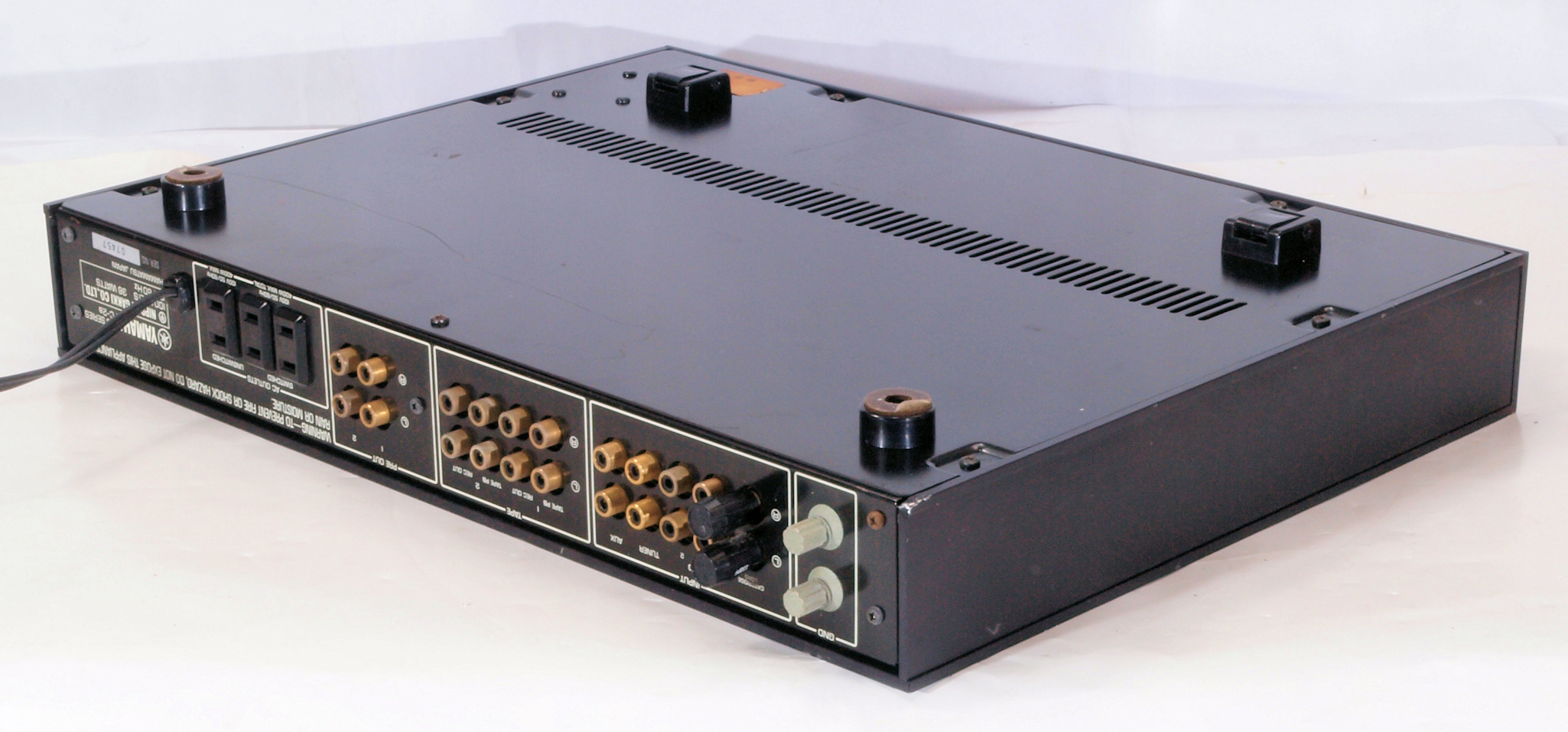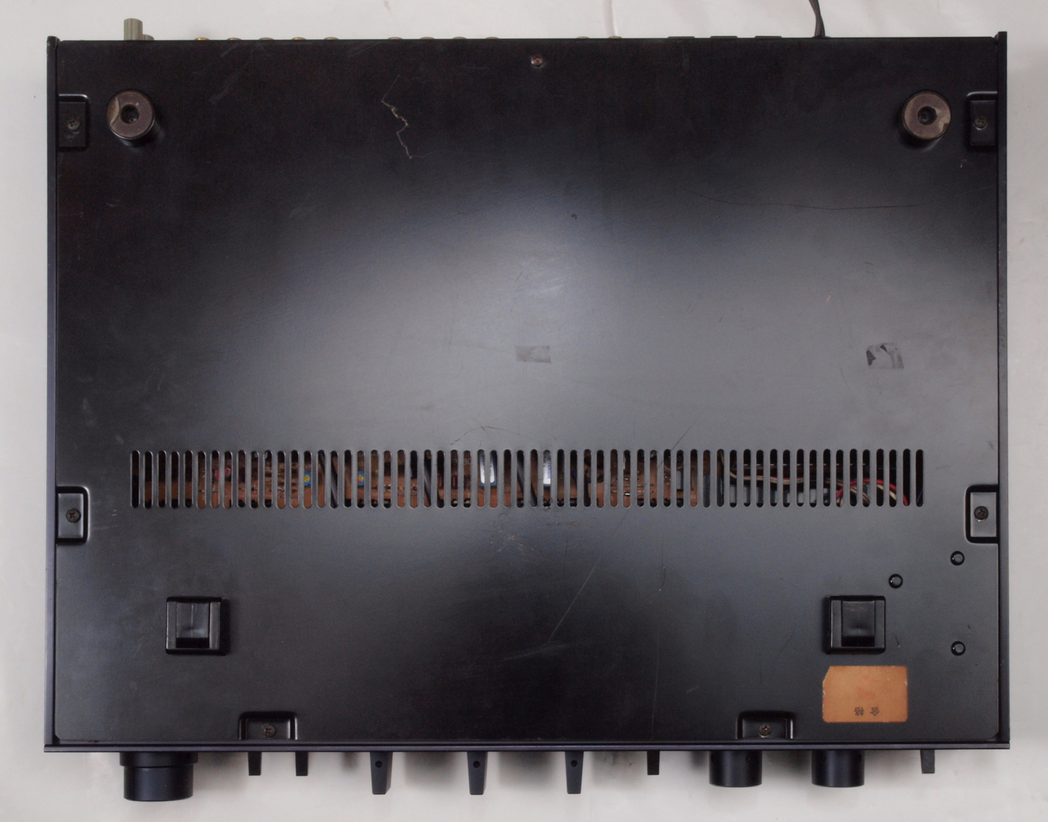 | A2A. 点検中 上下カバー、シールドを取り、下から見る。 トーンアンプ・ヤマハオリジナルの出力のフイルムコンデンサーが電解コンデンサーに交換されている。 | ||||||||||||||||||||||||||||||||||||||||||||||