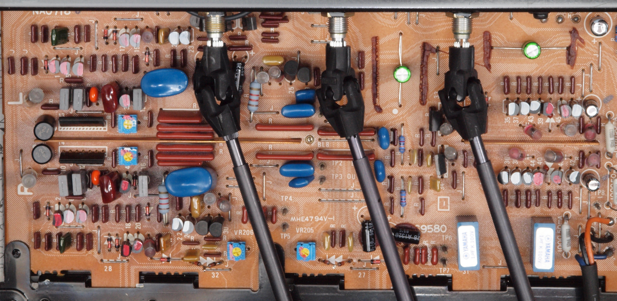 | A28. 点検中 上下カバー、シールドを取り、下から見る。 EQアンプ・ヤマハオリジナルの出力のフイルムコンデンサーが電解コンデンサーに交換されている。 | ||||||||||||||||||||||||||||||||||||||||||||||