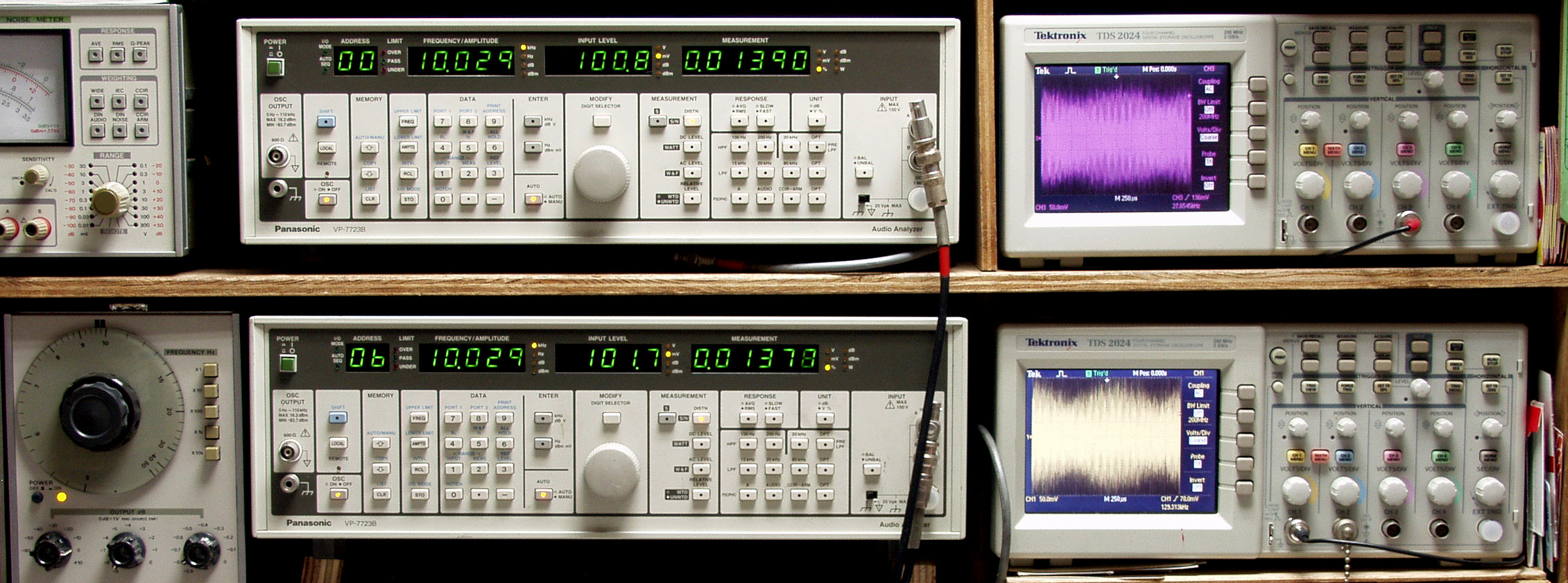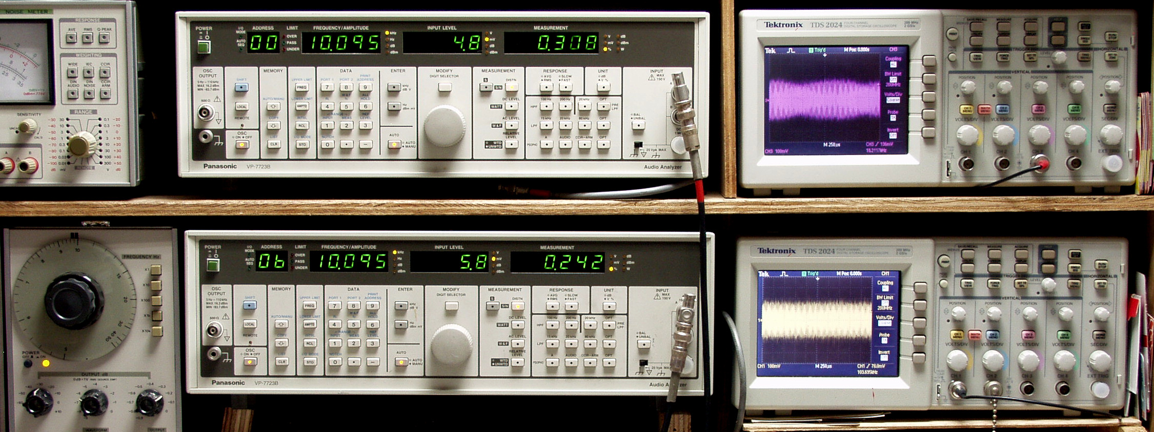 | G. 測定機器の出力・歪み率測定。最新の測定方法はこちら。 「見方」。 上段中央オーディオアナライザ VP−7723B=R側測定。LED表示は右から、「歪み率」、「SP出力電圧」、「周波数」。 下段中央オーディオアナライザ VP−7723B=L側測定。LED表示は右から、「歪み率」、「SP出力電圧」、「周波数」。 上段右端オシロ TDS−2024=R側歪み出力波形表示。 下段右端オシロ TDS−2024=L側歪み出力波形表示。 下段左端 オーディオ発振器 VP−7201A より50Hz〜50kHzの信号を出し(歪み率=約0.003%)、 ATT+分配器を通し測定する。 よって、発振器ダイアル設定出力レベルより低くなります。 AUXレベル100mV=CD、Tuner、Radio、Tape入力等のレベル。 MMレベル5mV =PonoMMカートリッジのレベル。 VV−AMP1V=真空管メインAMPや大型AMPのレベル。 |