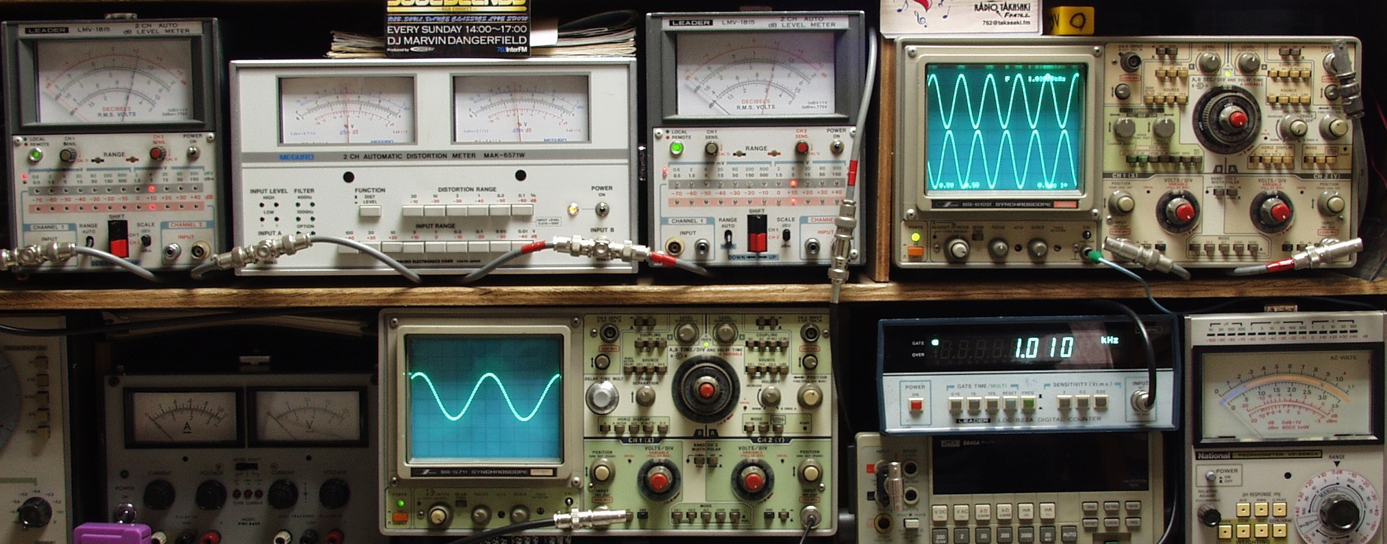| E. 測定・調整。 画像をクリックすると、大きく(横幅2050ドット)表示されます。 E1. 調整・測定 左上のパワーオーディオ発振器からネットワークに入力、LF出力=L出力、HF出力=R出力とする。 |