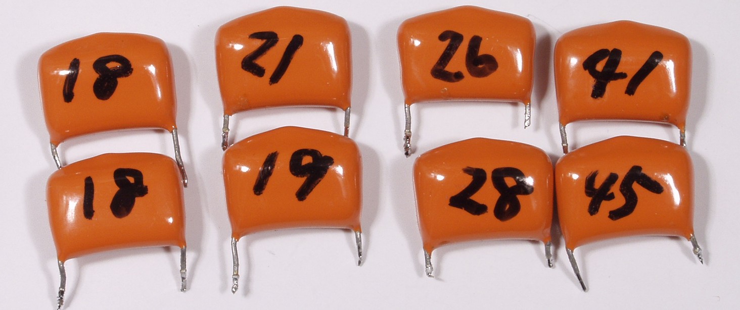 | A4. 点検中 フイルムコンデンサーの比較 上=使用されている物 下右=現在の物 下左=積層セラミック | ||||||||||||||||||||||||||||||||||||
