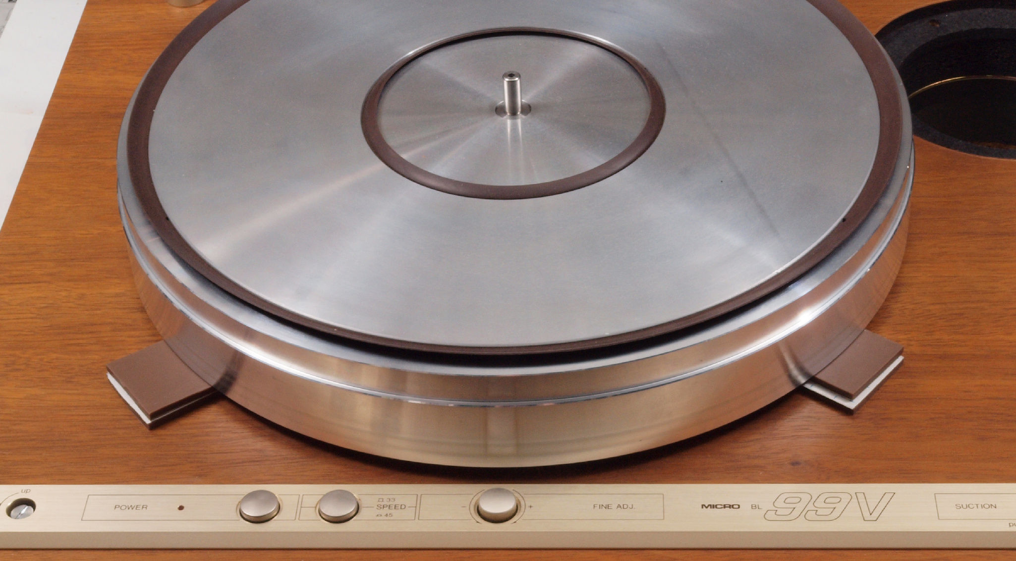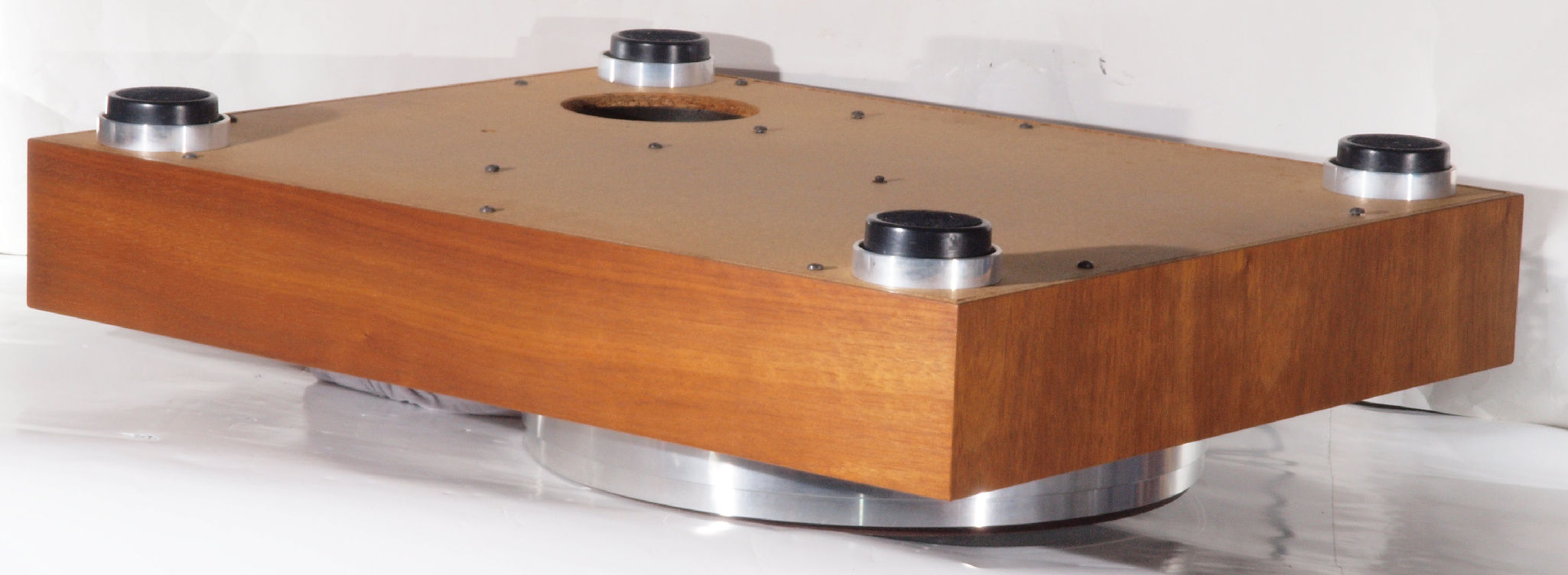 | A16. 点検中 上から見る。ユーザはタンテーブル(プラッター)が外せないので「かいものを」入れて固定。 このタンテーブル(プラッター)がアルミ製で軽いので、軸への負担は少ない。 |