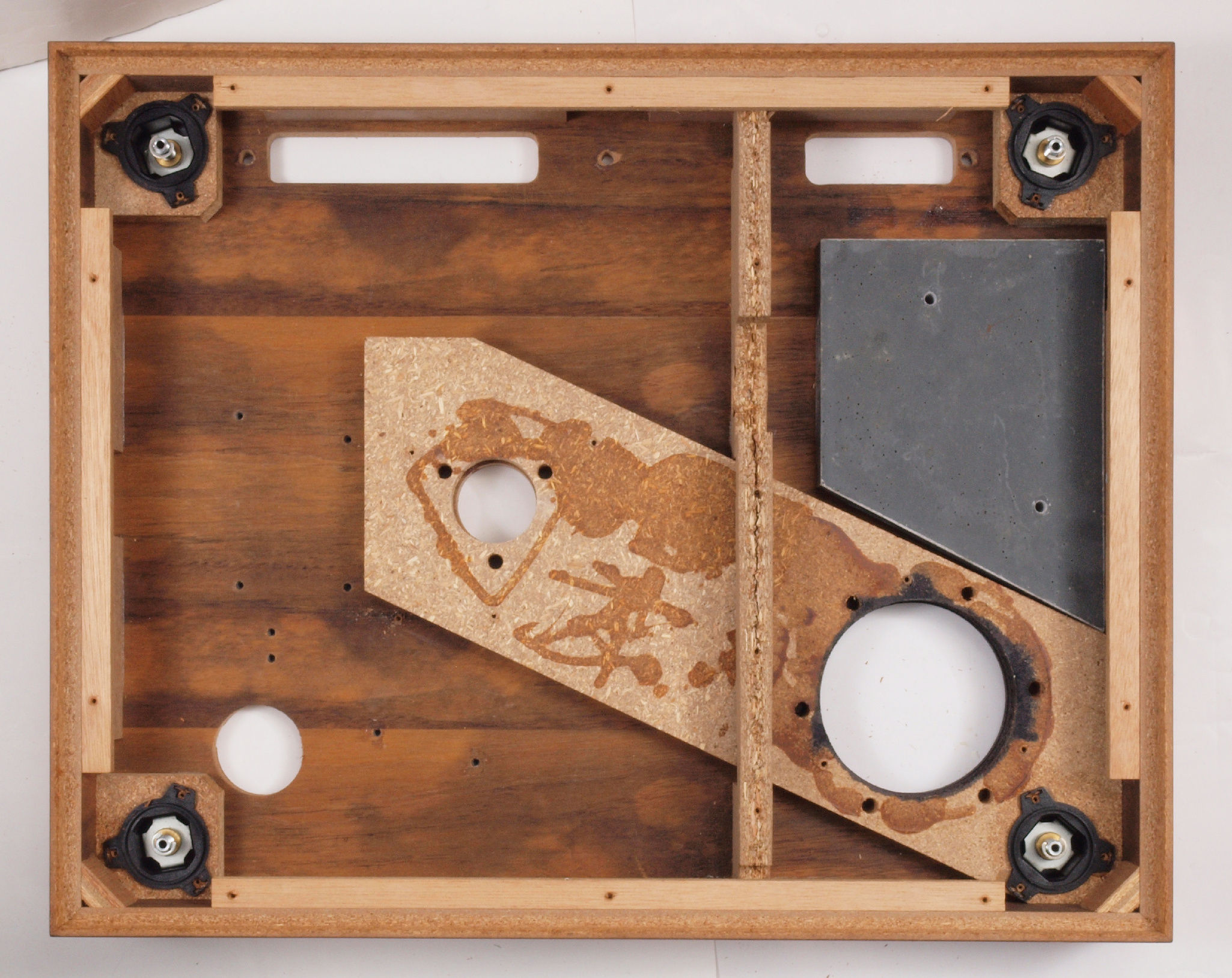 | W1A. 修理後 本体木枠下、後左より見る。 更にウレタン塗料を塗る。 | ||||||||||||||||||||||||||||||