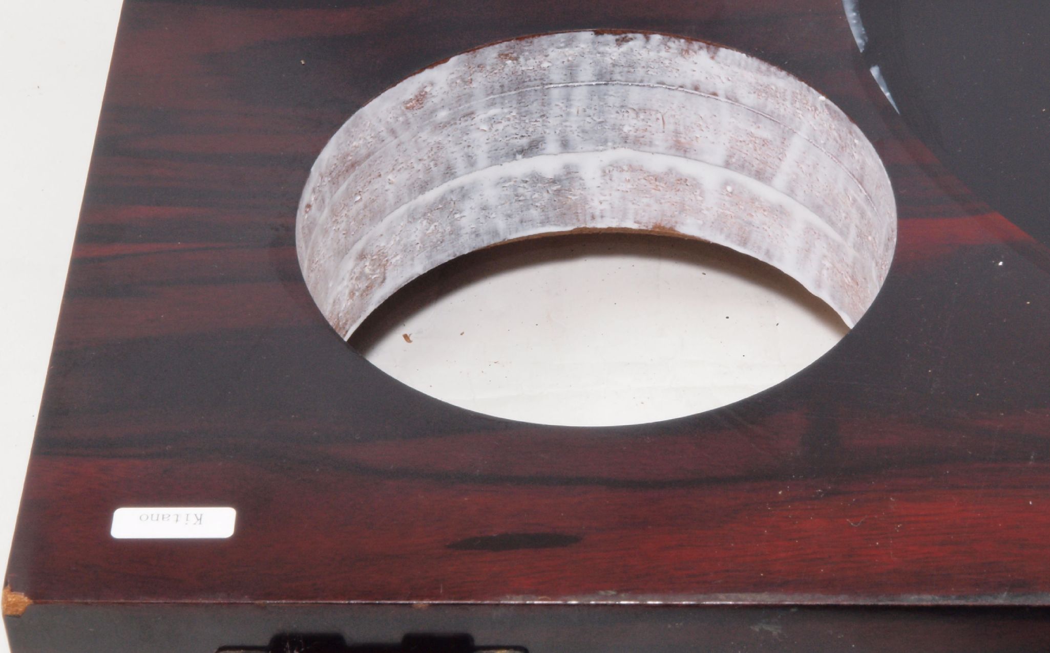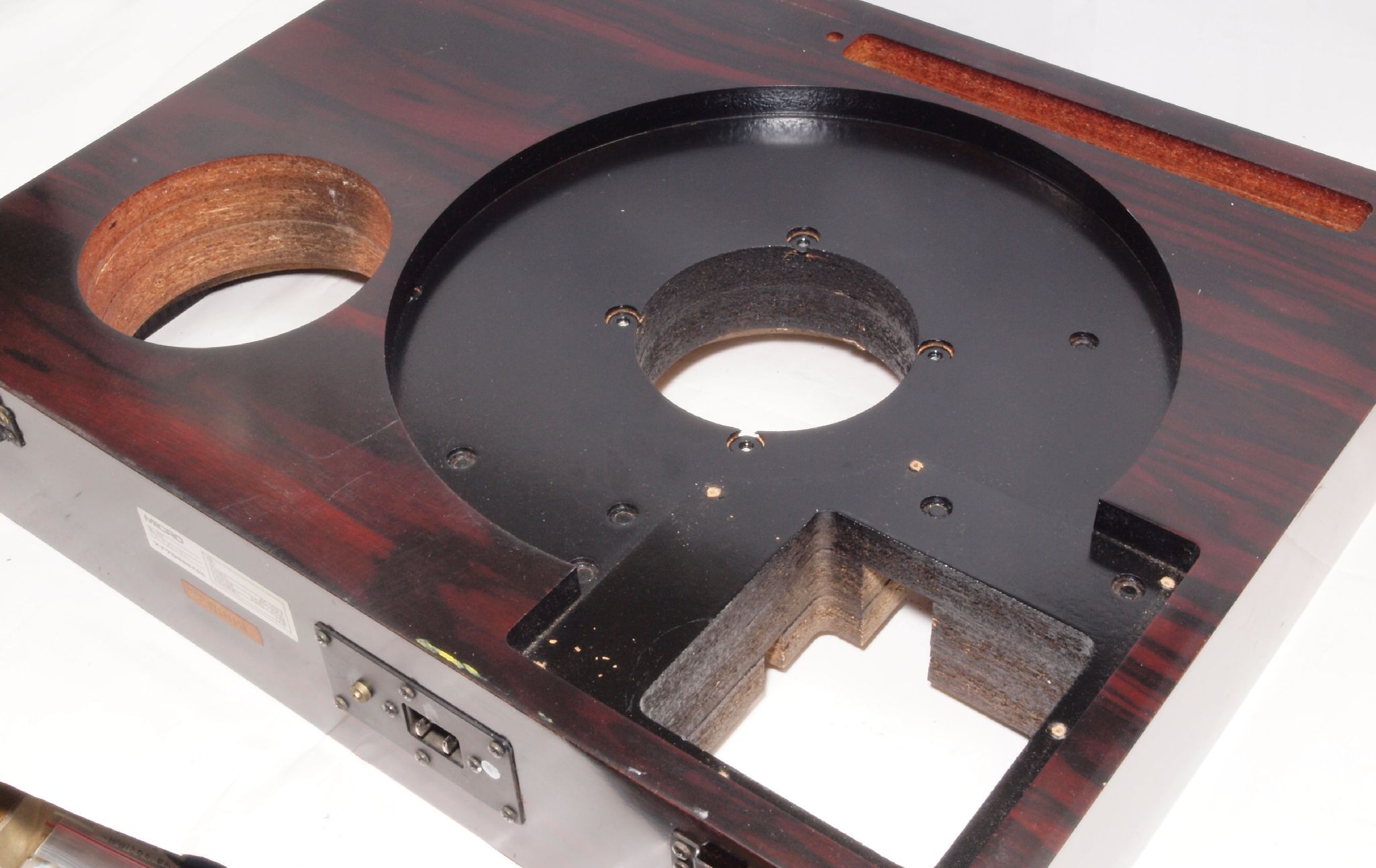 | W. 下蓋及び本体木部 修理状況。 画像をクリックすると、大きく(横幅2050ドット)表示されます。 W1. 修理前 モーター、基板、アーム架台を取り本体上から。 |