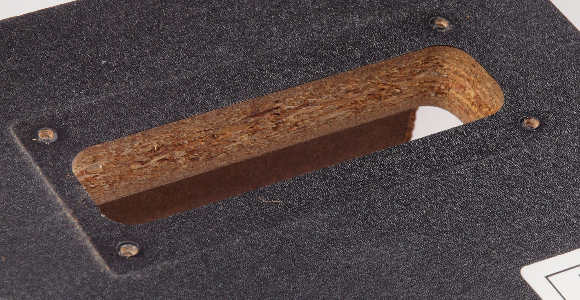 C44. 修理前 接着材が劣化した木箱圧縮板左側。