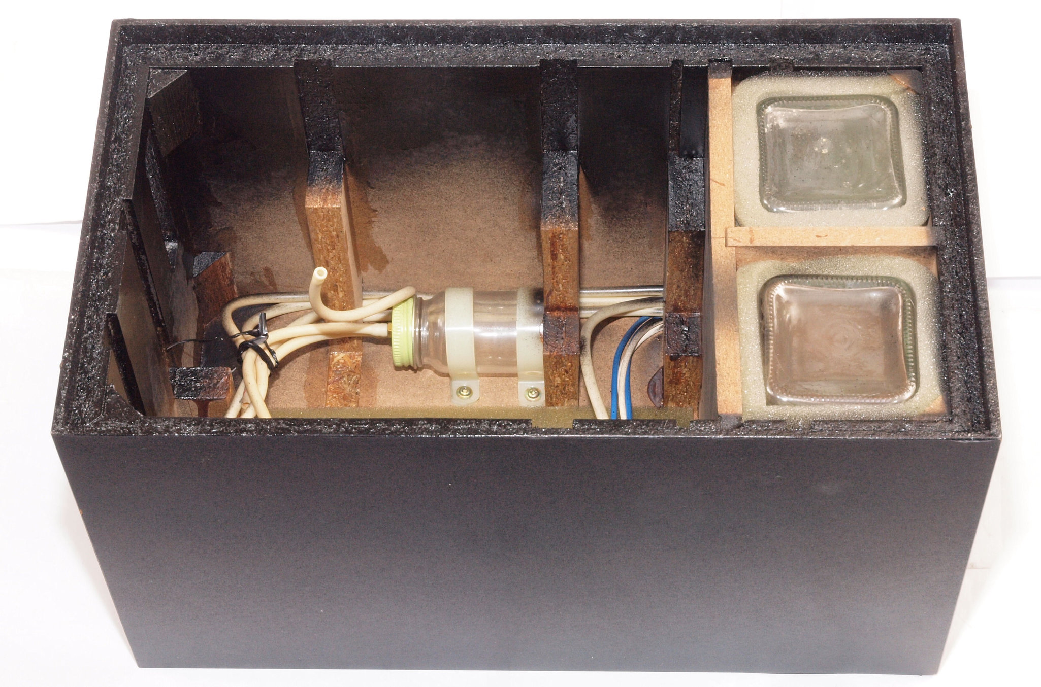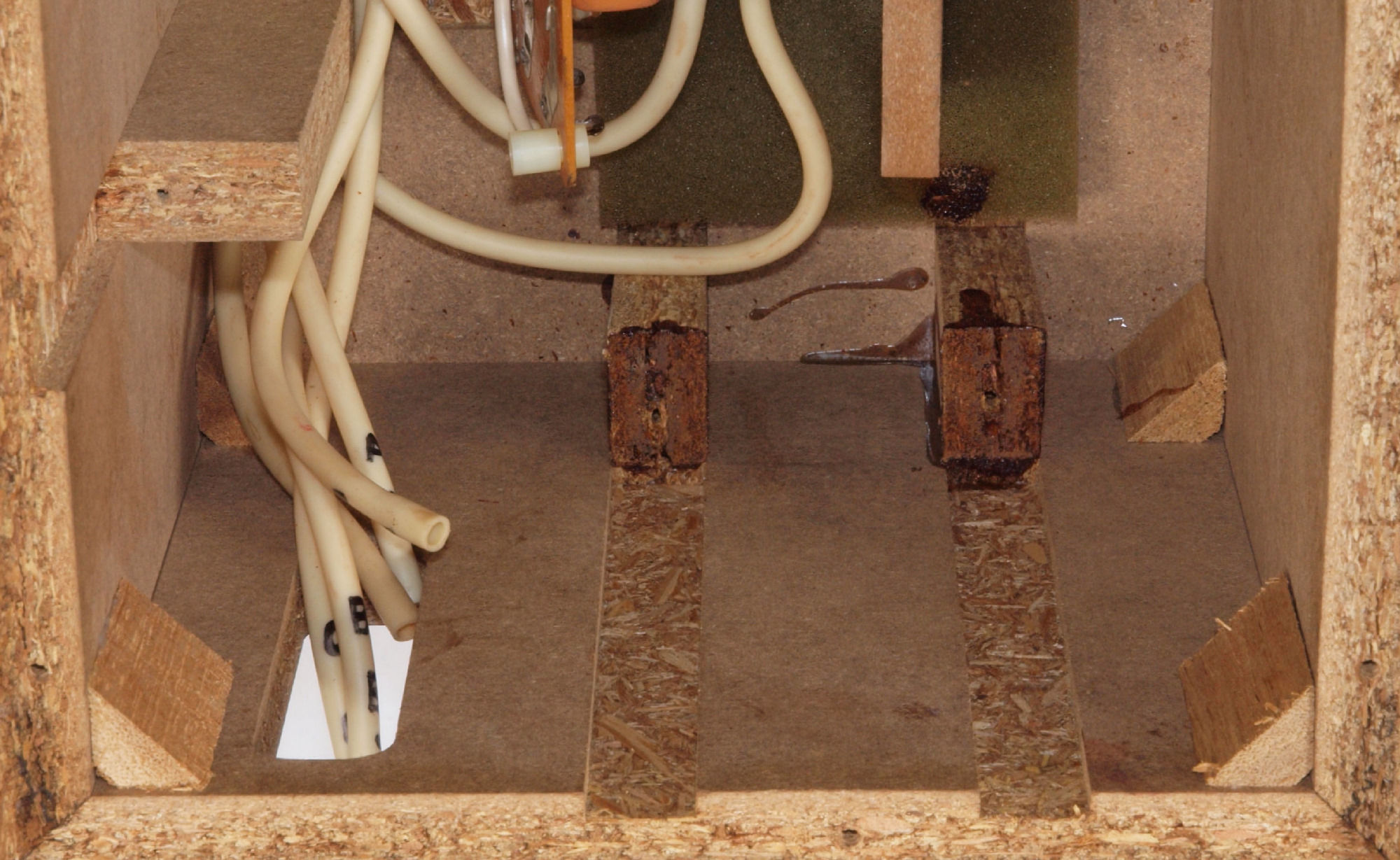 C41. 修理前 接着材が劣化した木箱圧縮板右側。