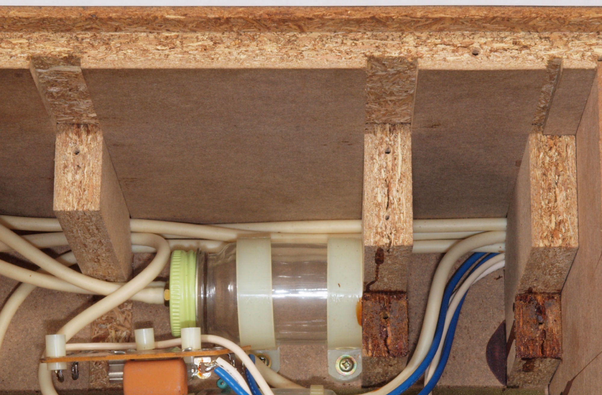 C64. 修理中 木ネジで割れた、「ポンプ取り付け板」、ボンドを染みこませる。