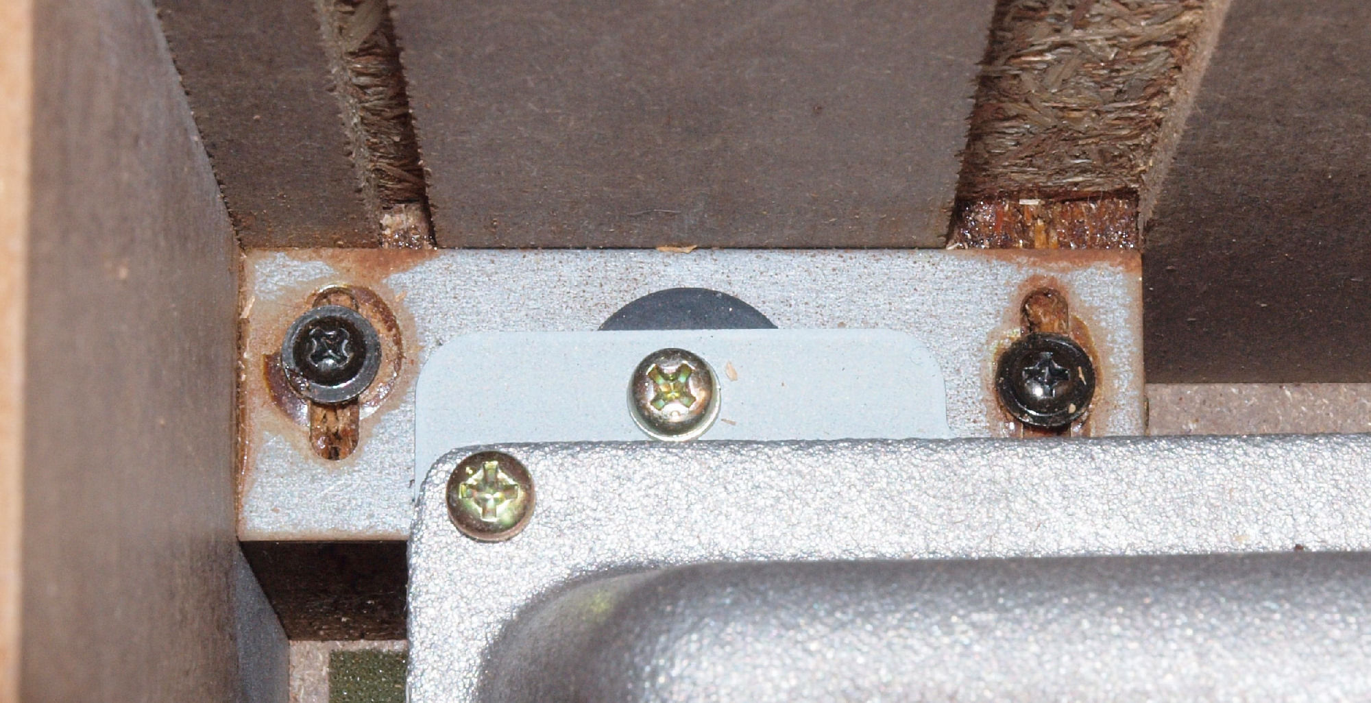 | C61. 修理前 木ネジで割れた、「ポンプ取り付け板」。 | ||||||||||||