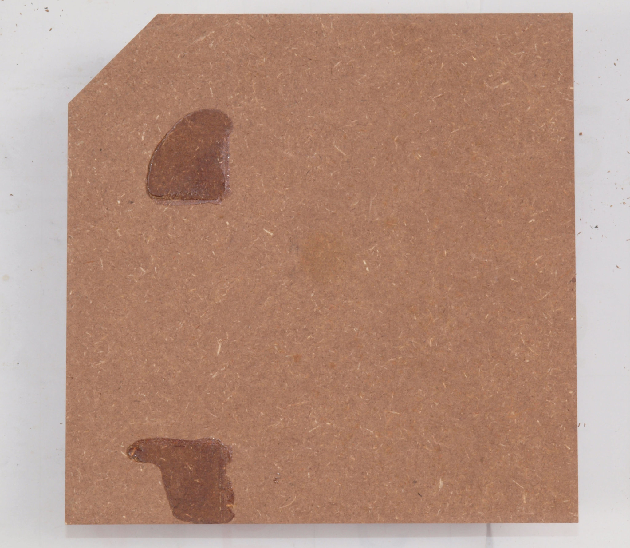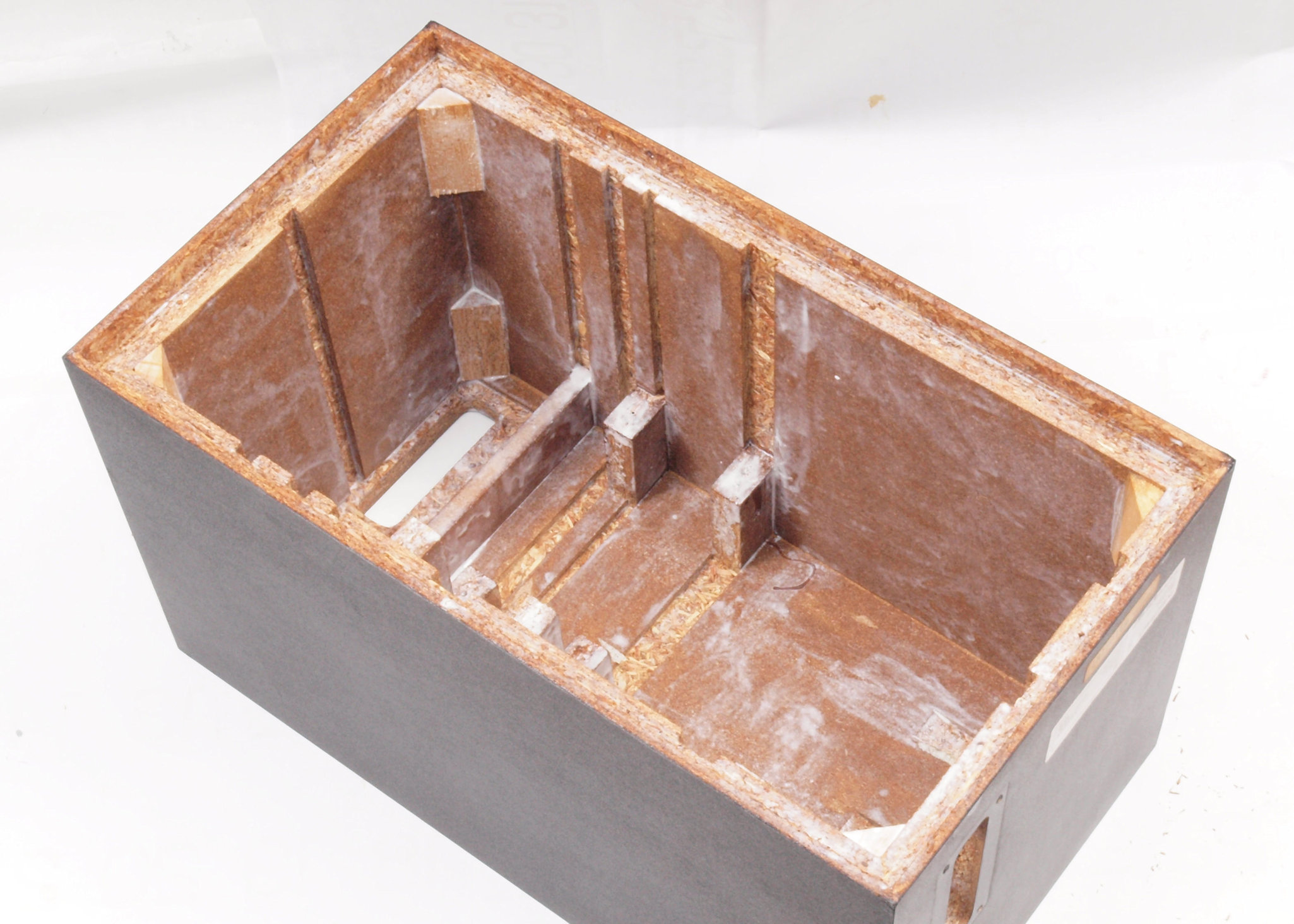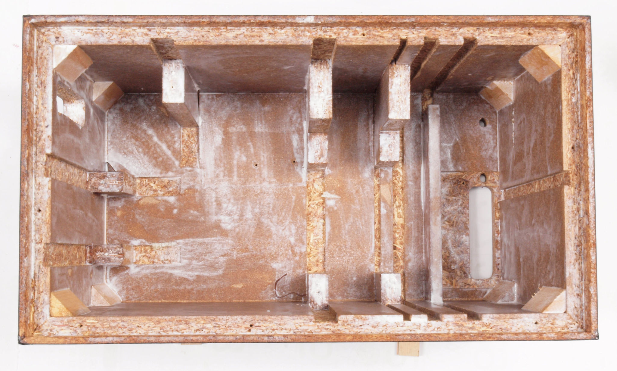 | C48. 修理中 接着材が劣化した木箱、下後左から見る。圧縮板にボンドを塗って固めている。 | ||||||||||||