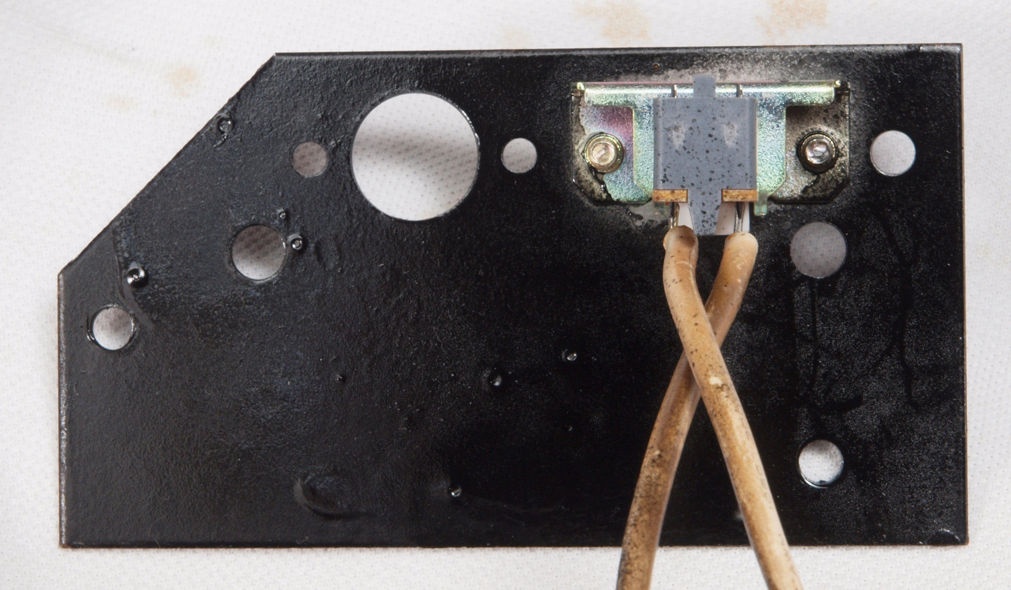 | CB2. 修理(塗装)後 電源SW取り付け板表。 プシュボタンが接着し有るのでこのまま、錆を落とし塗装する。 |