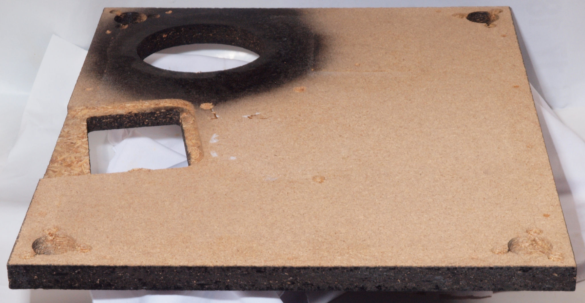 W712. 修理前 底板裏側、トランスカバーを取付ける所。 止めビスが圧縮材を割る。