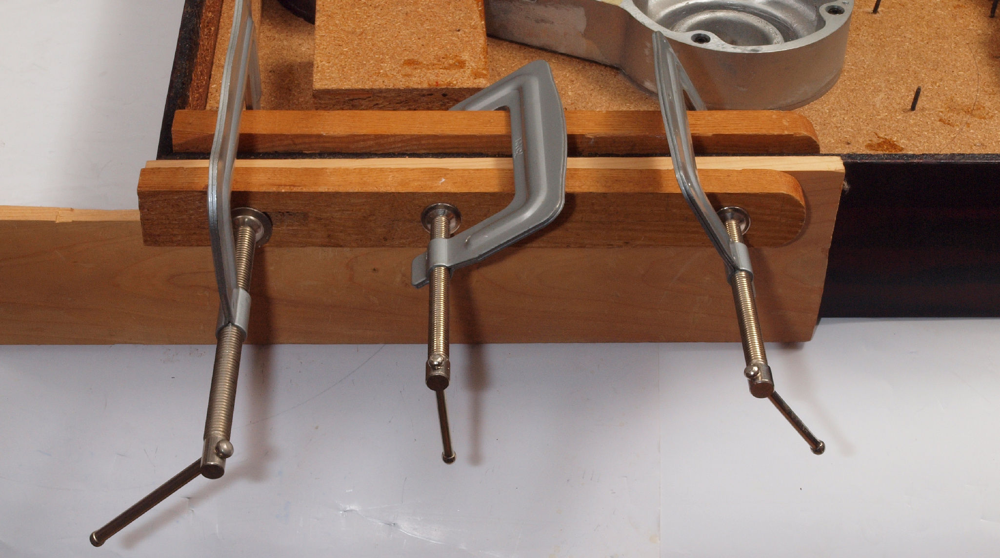 W213. 修理中 本体下、 前から。 圧縮材の膨らみが大きいので、ボンドの生乾きの内に、シャコ万力で圧縮する2。