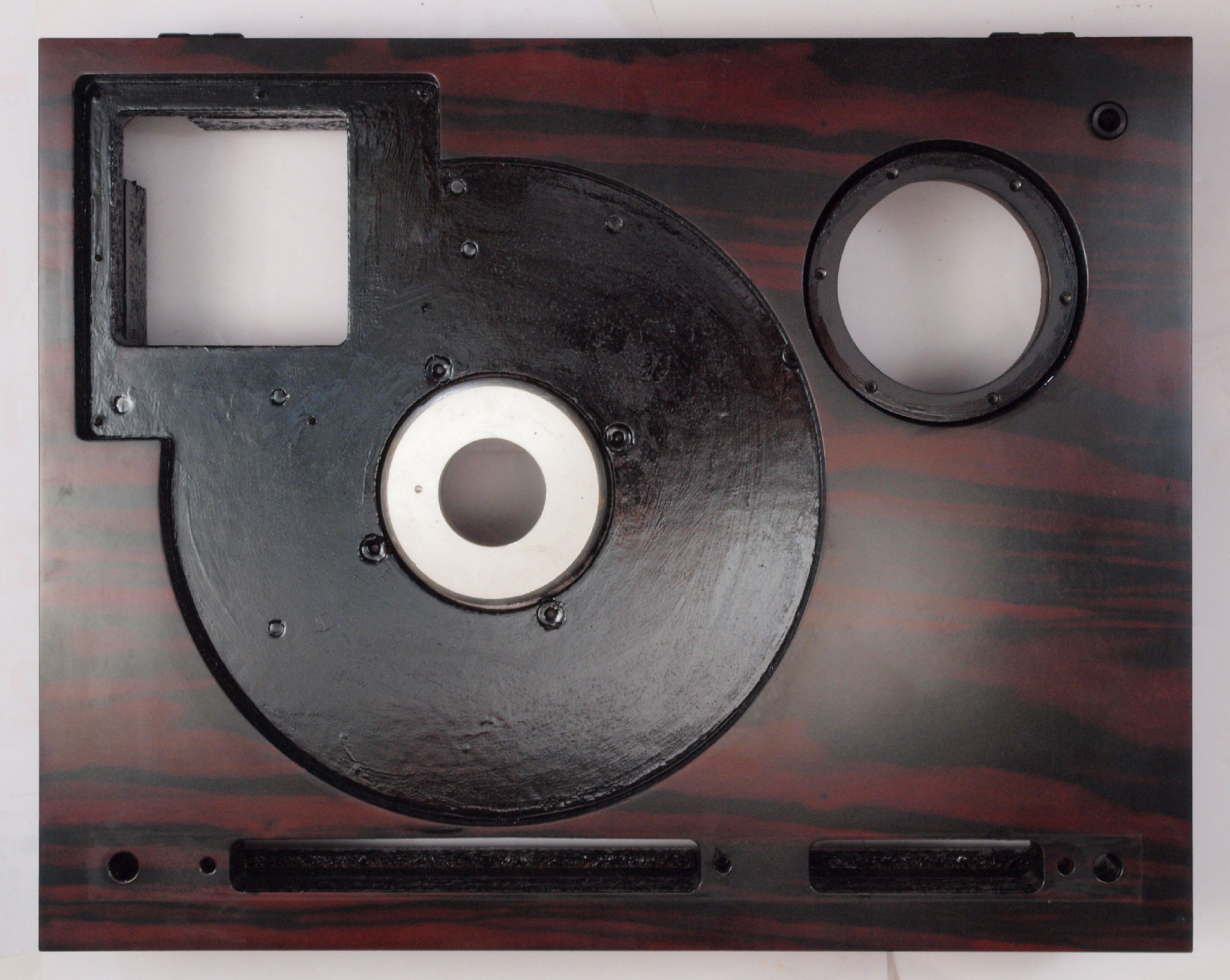 W7C. 修理中 底板裏側、アーム取り付け穴、反対側。さらに、キズを消す為と割れを防ぐのに、ペンキを塗る。