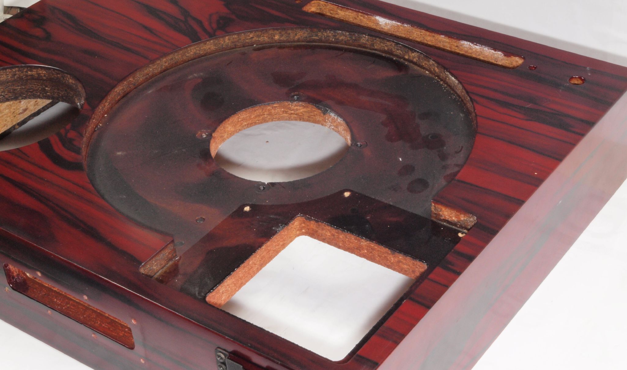 W1C. 修理後 タンテーブル取り付け穴。 キズを消す為と割れを防ぐのに、塗装する。