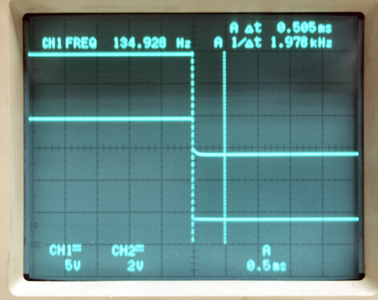 | AE22. 45回転測定。 上のが134HZ基準矩形波、下がタンテーブルの回転矩形波。 差が最大時。 上下の点線のスケール間が、仕様書規定許容値の0.5ms、十分に規格内 |