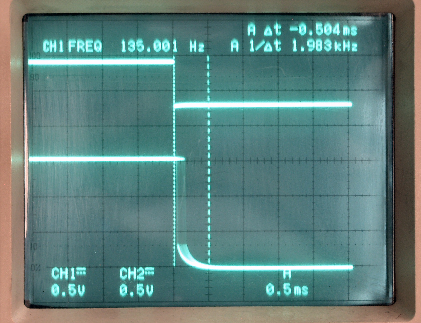 | AE21. 45回転測定。 上のが134HZ基準矩形波、下がタンテーブルの回転矩形波。 差が最小時。 上下の点線のスケール間が、仕様書規定許容値の0.5ms。 |