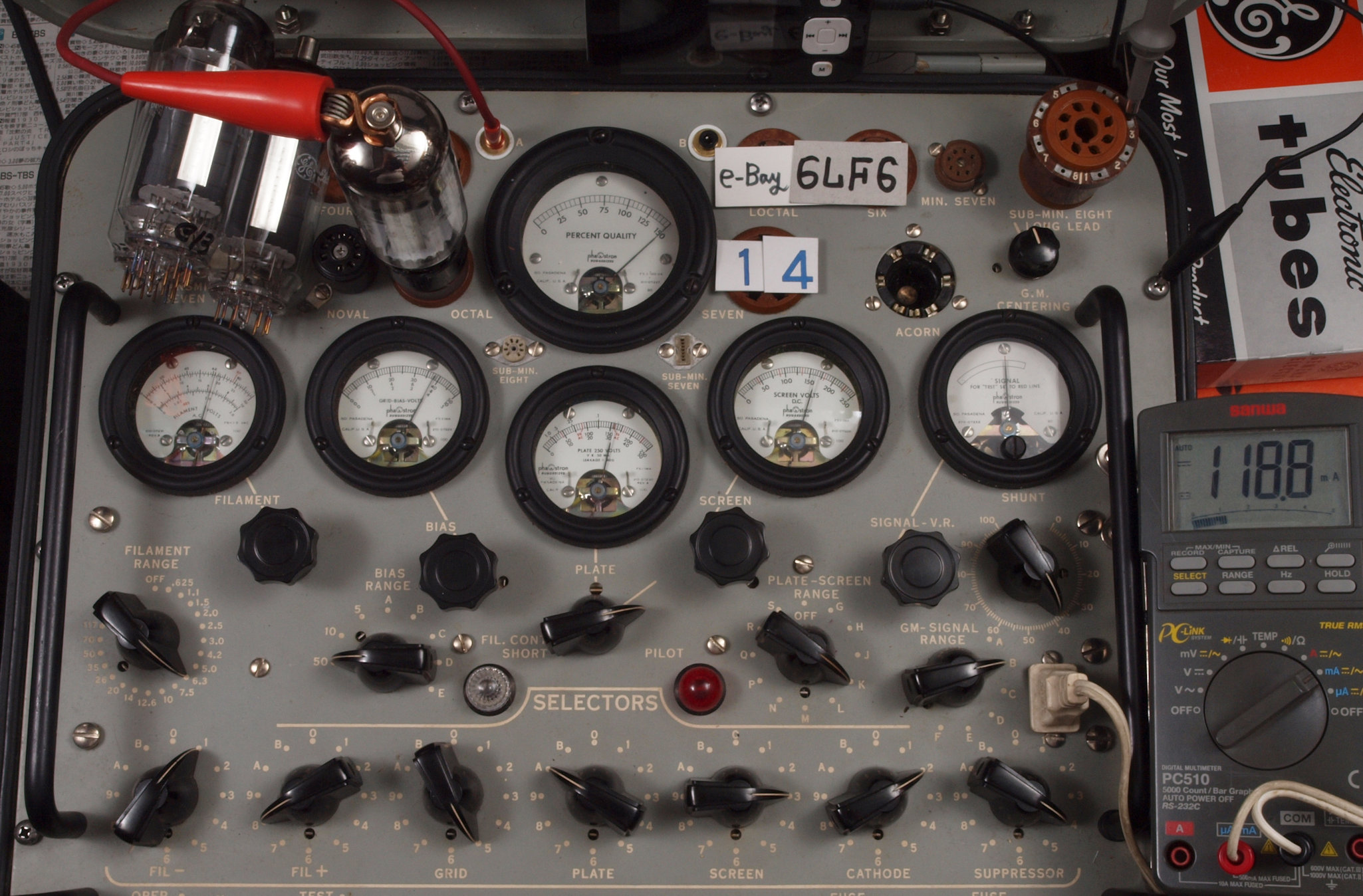| UA1. 10台目付属1本目「6LF6」。 Gm測定=14000μmho、 Ip=97.9mA。 測定条件、「Ep=Esg=160V、Eg1=−35V」、Bレンジ=15000μmhoでの測定。 |