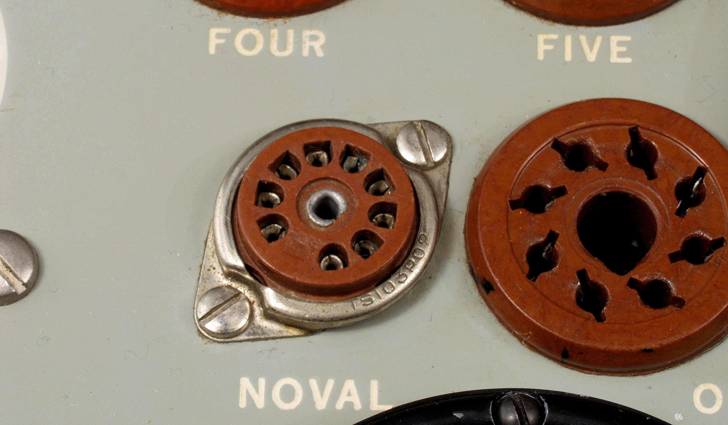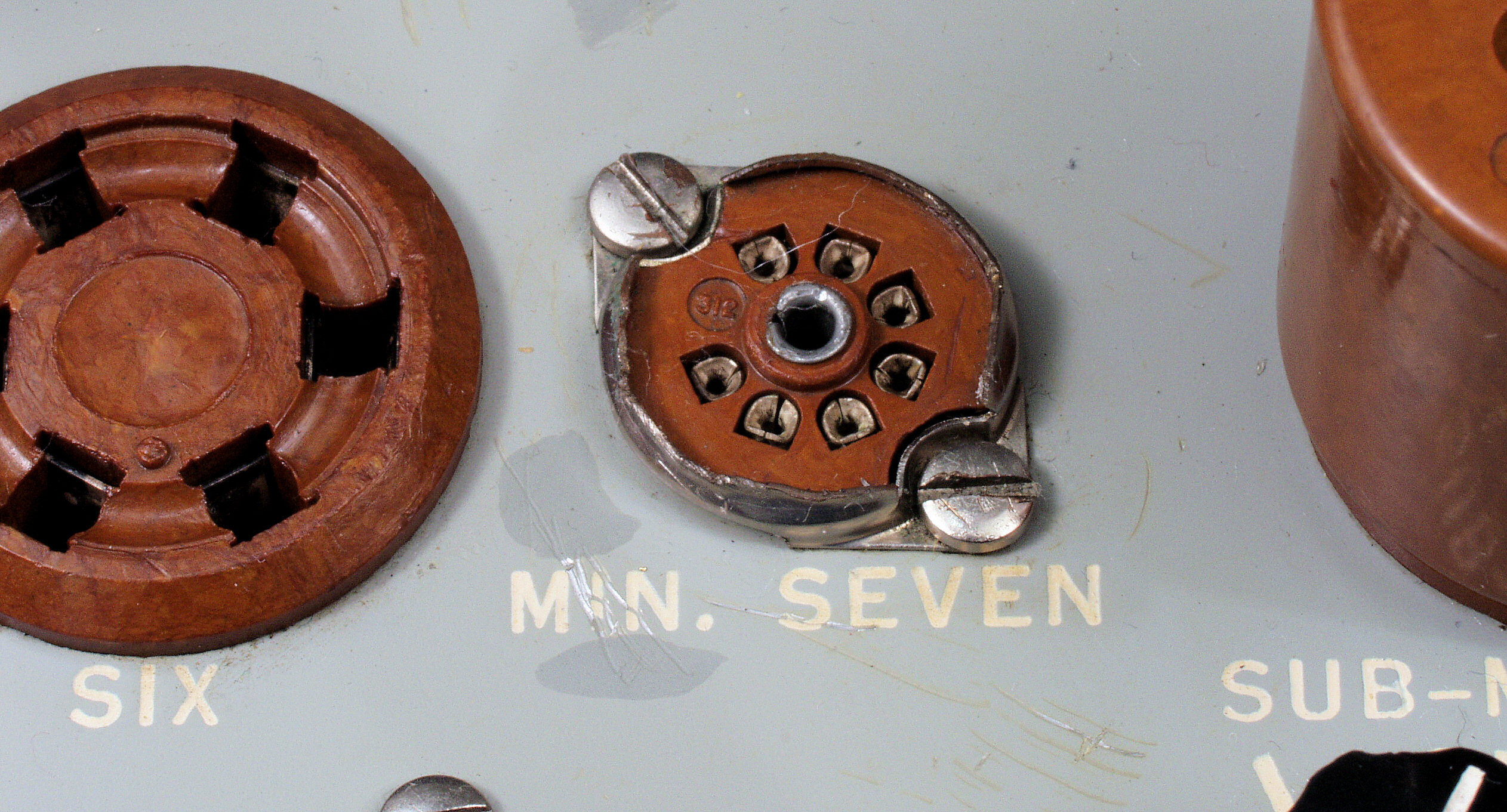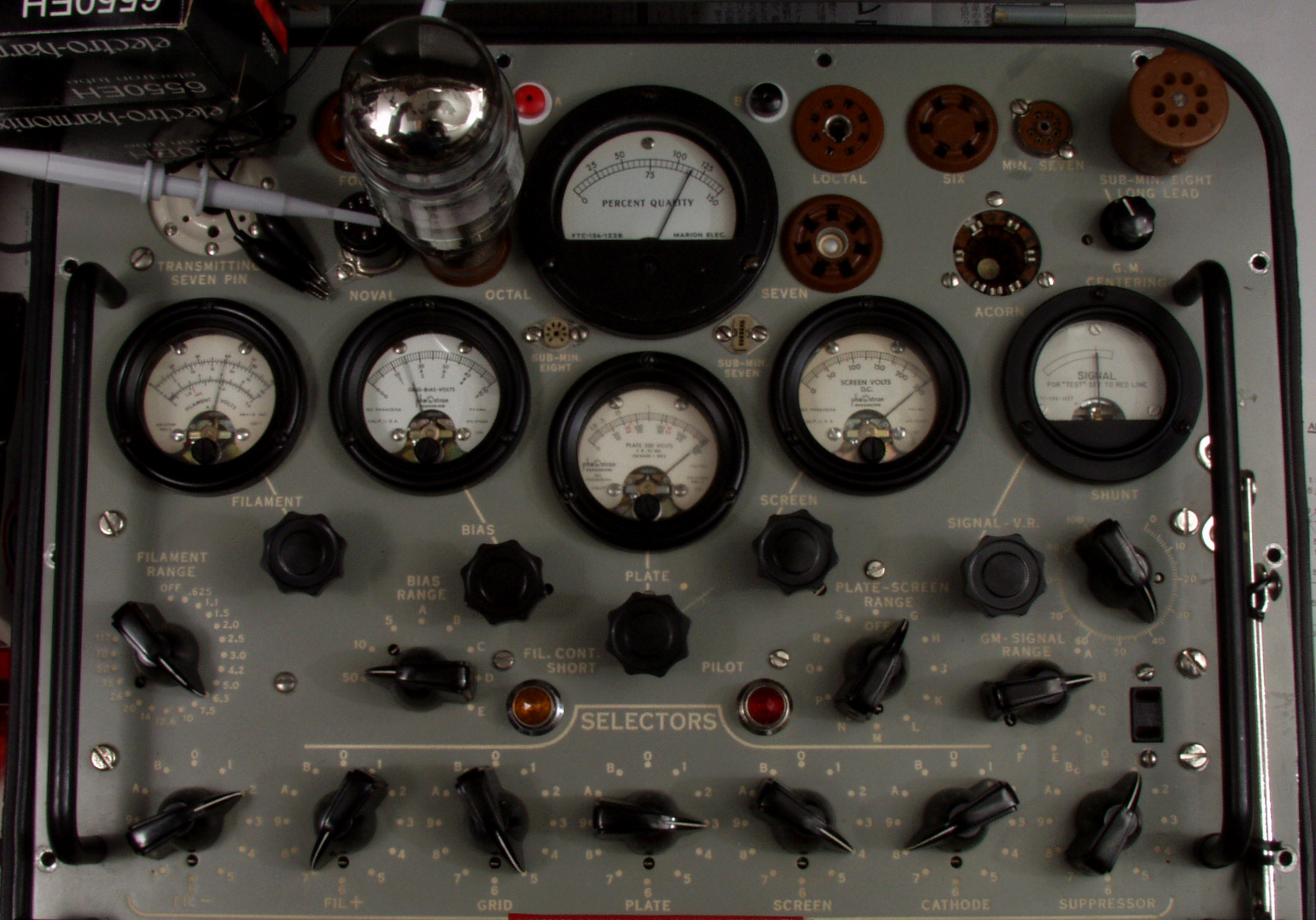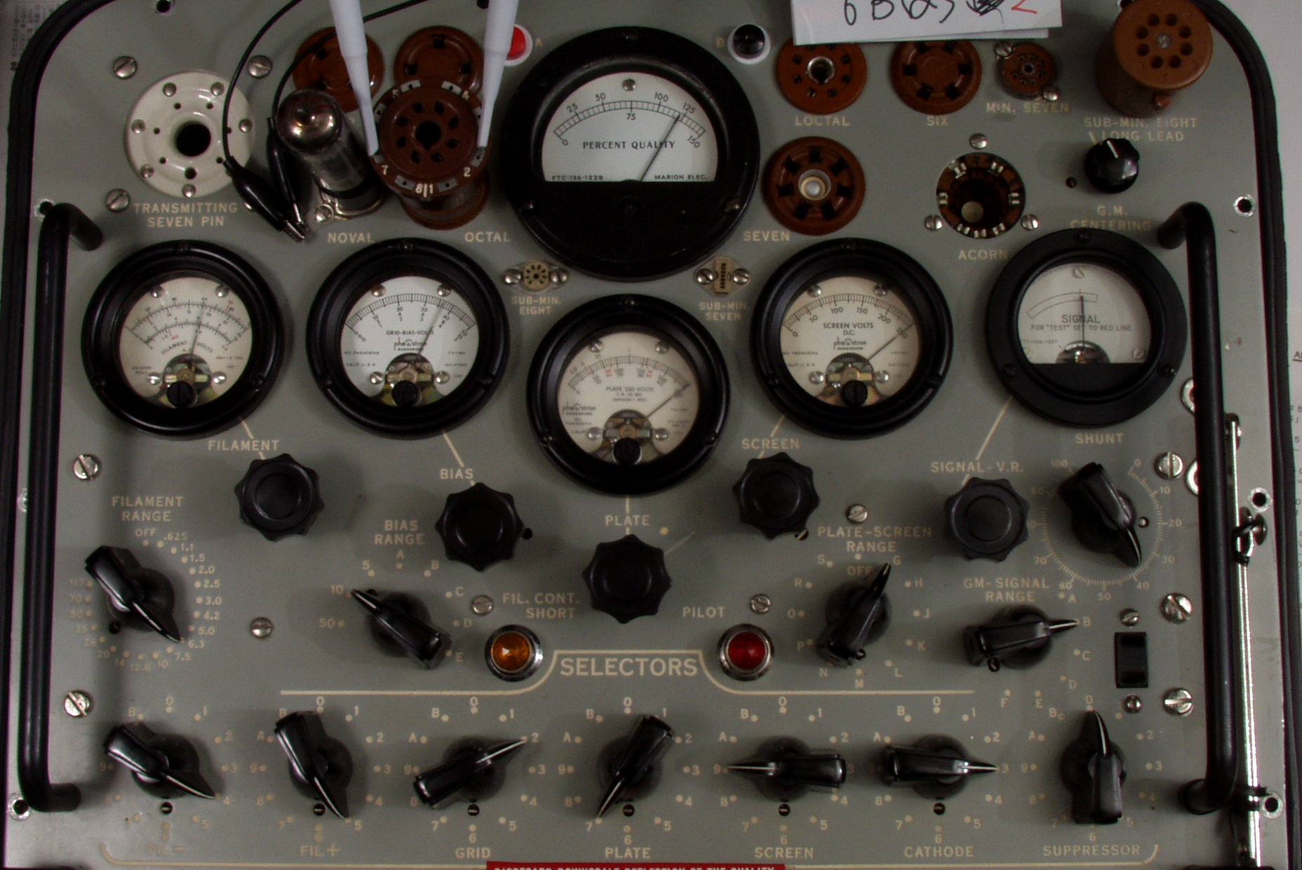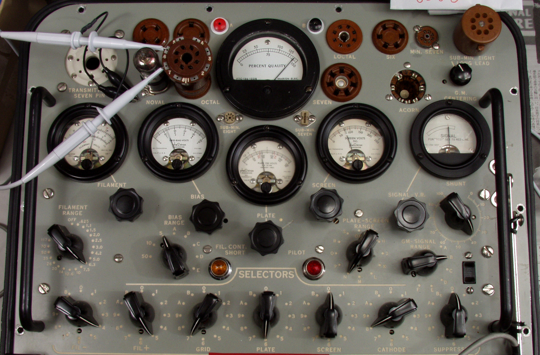 左側2本=グリット電圧計「GridBiasVoltMeter」、 右5本=ヒータ電圧計「FilamentVoltMeter」。