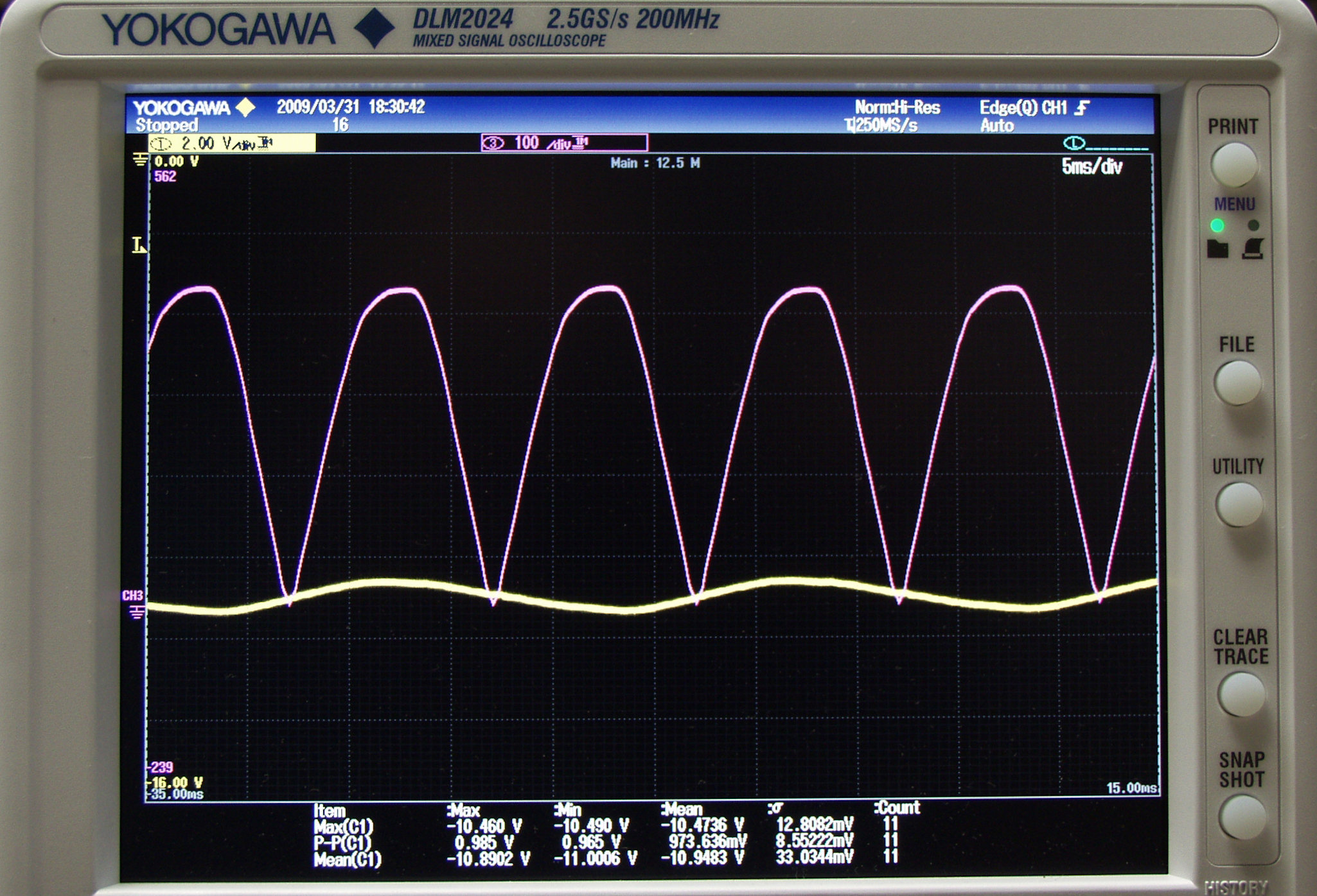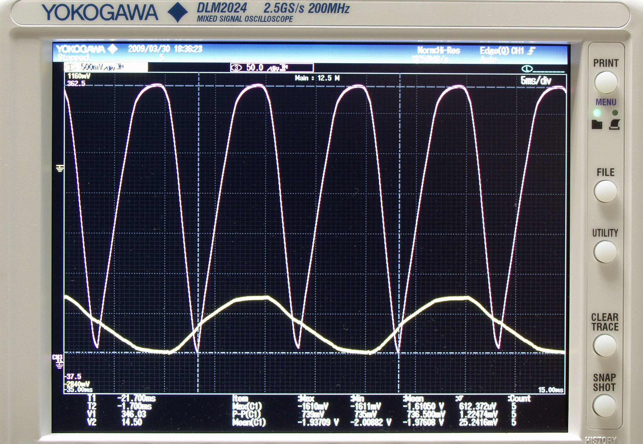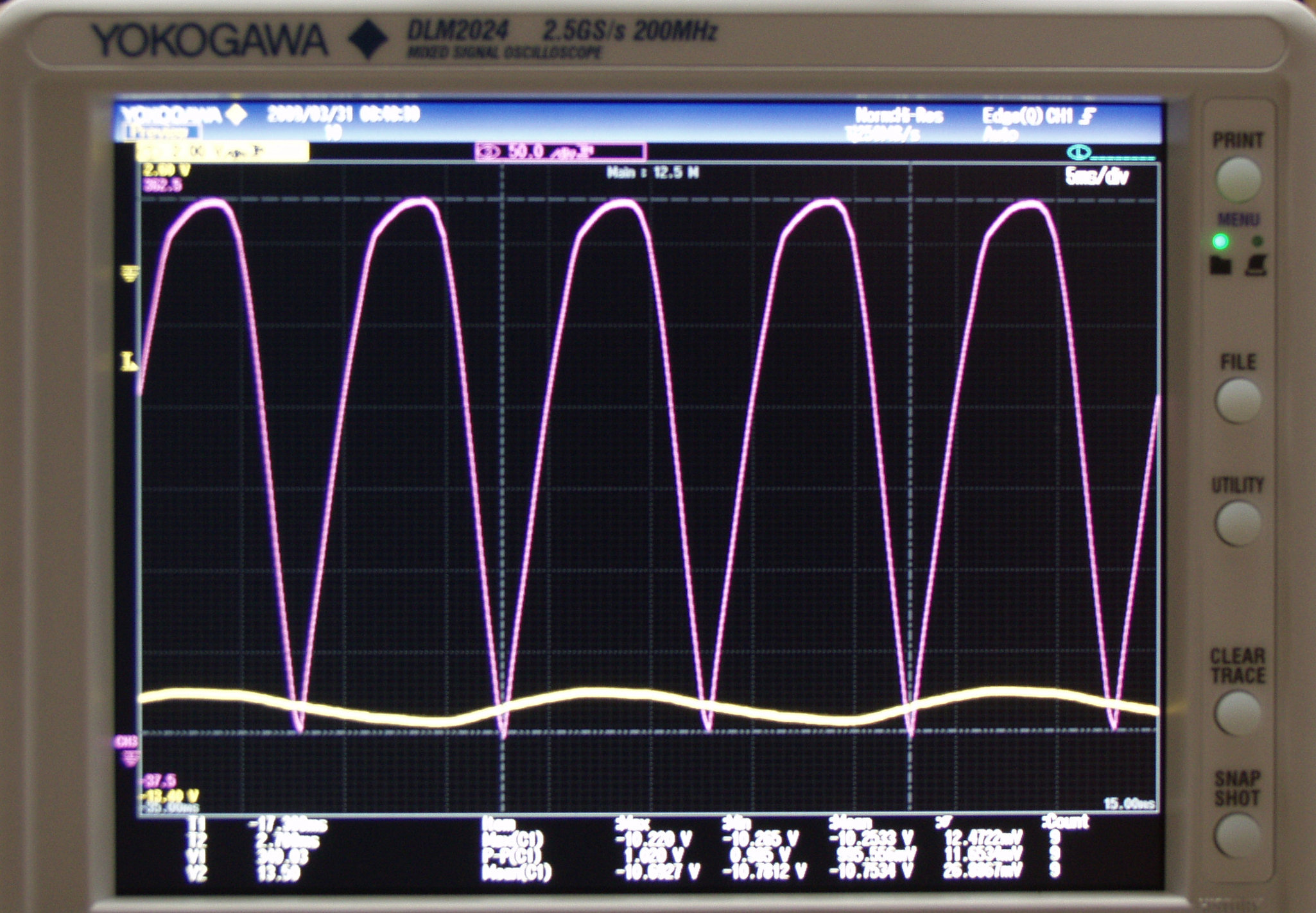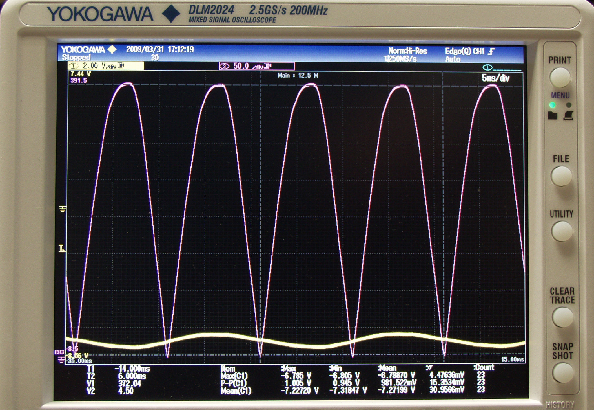 G25. 「electro−harmonix12BH7AEH」測定の入出力波形。 黄色=グリッド電圧、赤色=プレート電圧