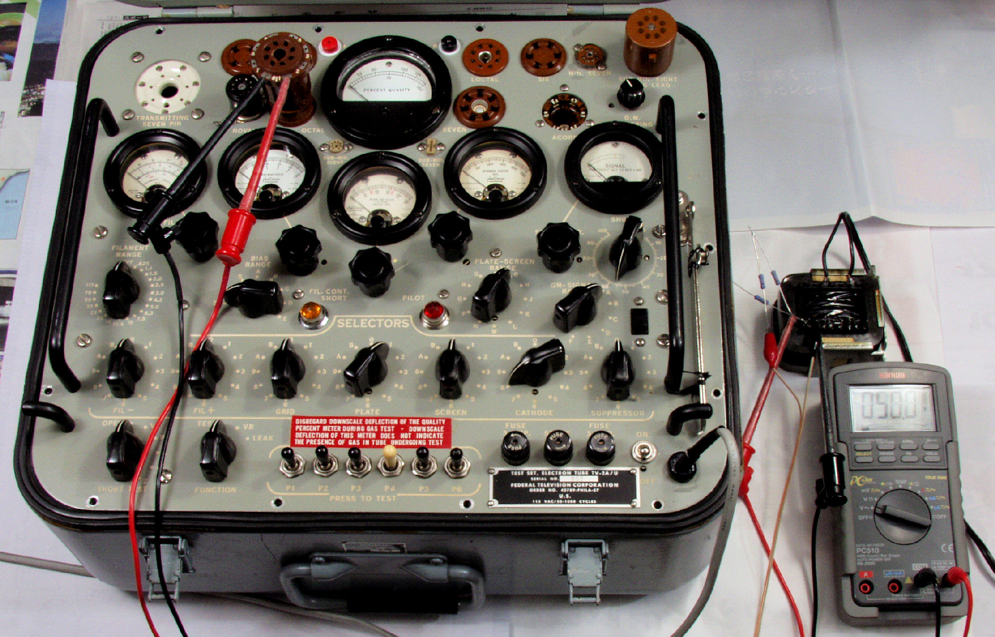 J11. RCA 6L6 のプレート電流、Gm測定。 Ip=2.4/50=48mA、Gm=5500μmho。
