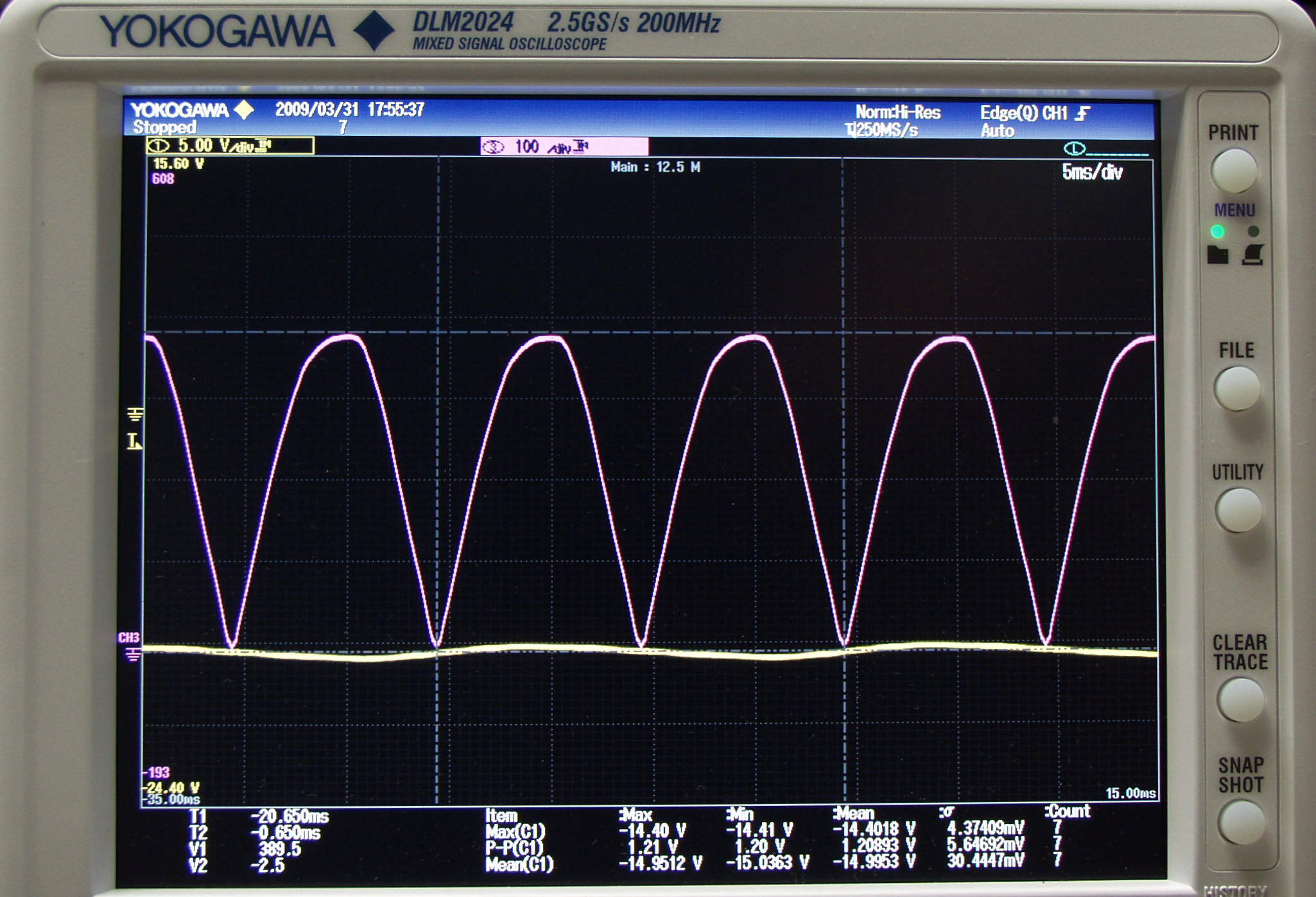 オシロの波形は 赤=プレート電圧、 黄色=グリット電圧。