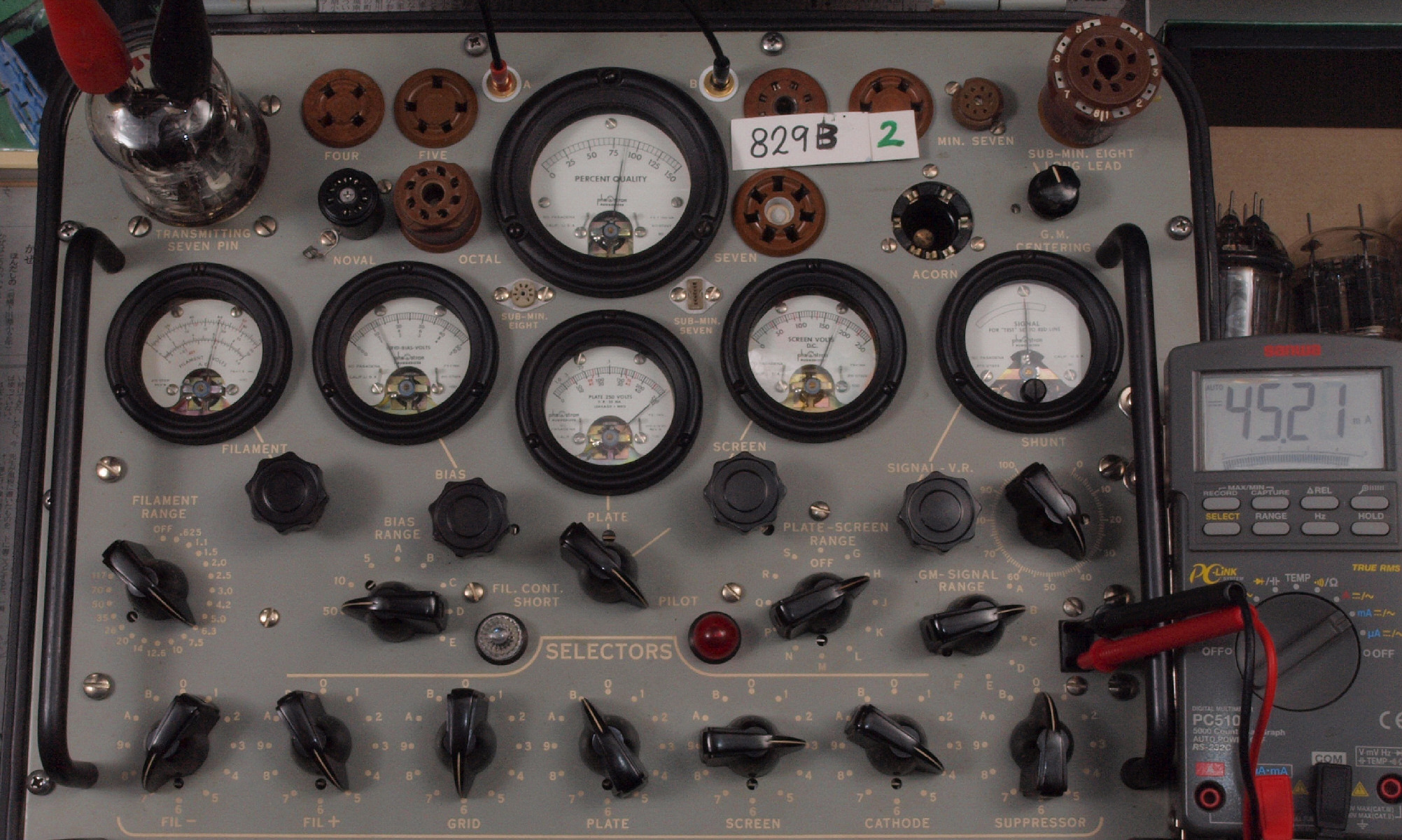 | B51. 5本目 829B ユニット1測定。 Gm=8500μmho、Ip=50.3mA。 測定条件、 「Ep=250V、Esg=175V、Eg1=−12V」RangeSW=C、FullScale=15000μmho。 |