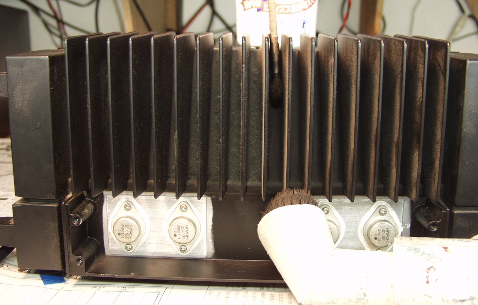 AMPの放熱器なども結構埃がコビリ付いています。 (特に愛煙家のAMP)愛煙家のかたは、「たばこの脂が+」して埃がこびりつきます。 これを取るには、消毒用アルコールを歯ブラシに付けて、ごしごしすると落ちます。