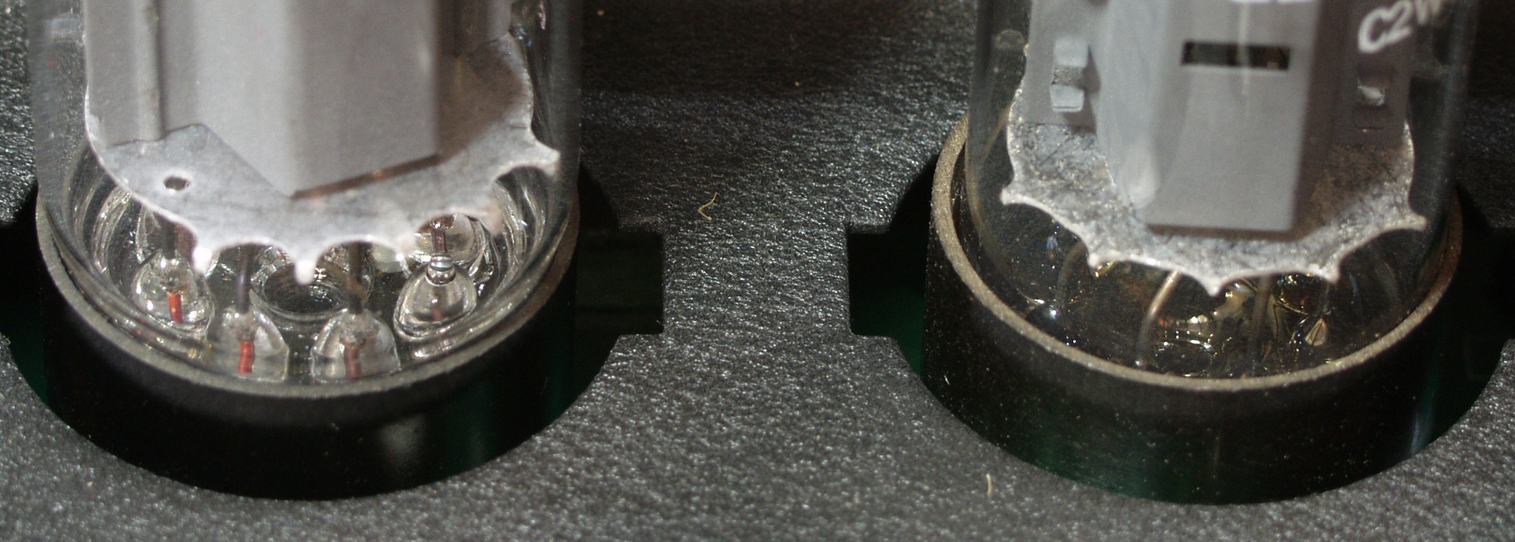 | 33. ステムの所を見ると良く解かる 下は6CA7(EL43)の場合です。 左=新品でガラスの部分が透き通っている。 右=中古品で黒ずんでいる。 |