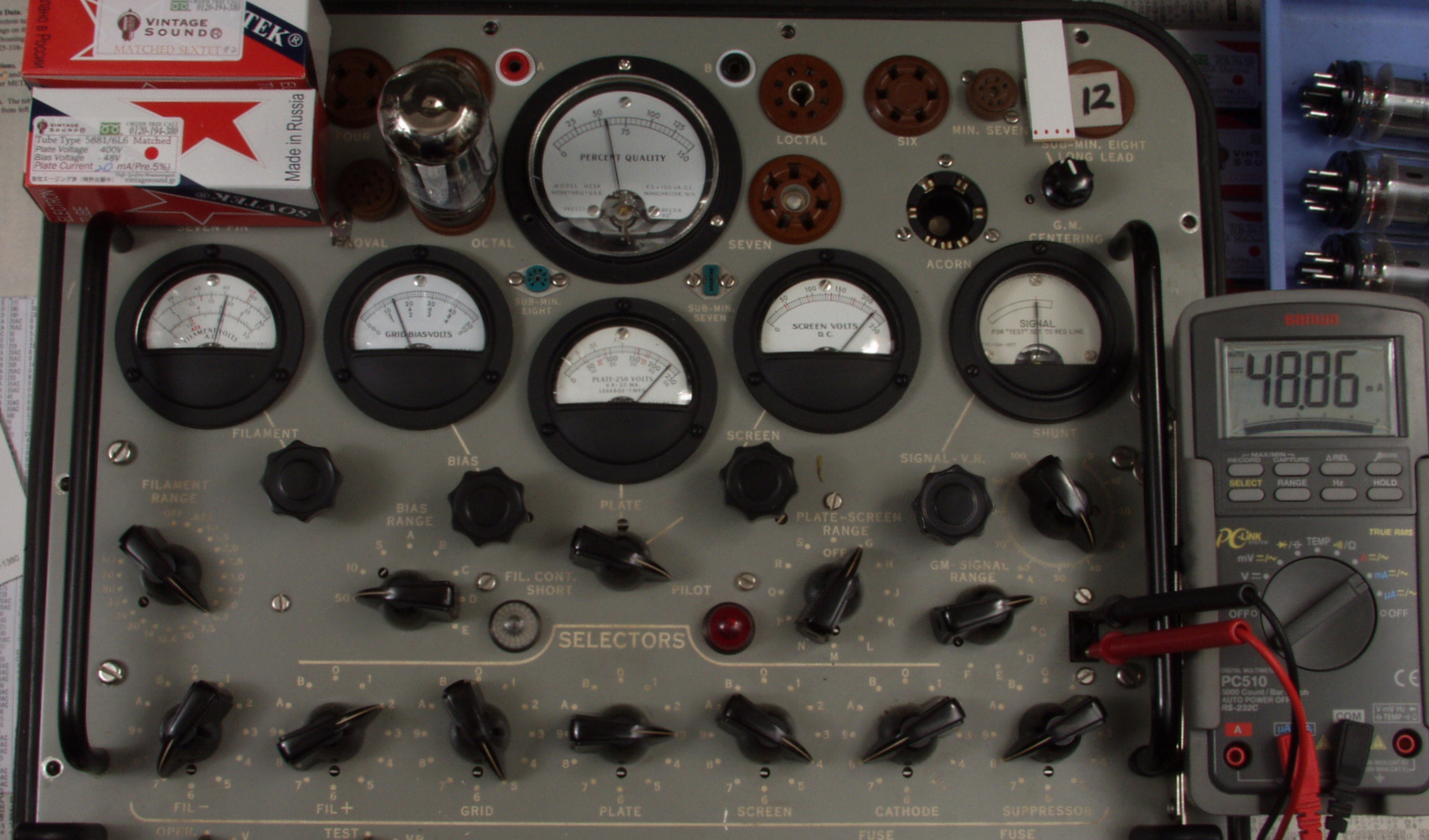 | CA10. 付属。 MESA STR 12AX7−A。 真空管ハンドブック(規格表)の値。 Dレンジ=1500μmhoレンジでの測定、「Ep=225V、Eg1=−2V」。 相互コンダクタンス=1600μmho「Ep=250V、Eg1=−2V」(1960/1962ナショナル真空管ハンドブックより)、(インプレス オーディオ用真空管マニアルより)、(RC−26、RC−30 Receiving Tube Manualより) MESA STR 12AX7−A。 左から1本目..4本目。 |