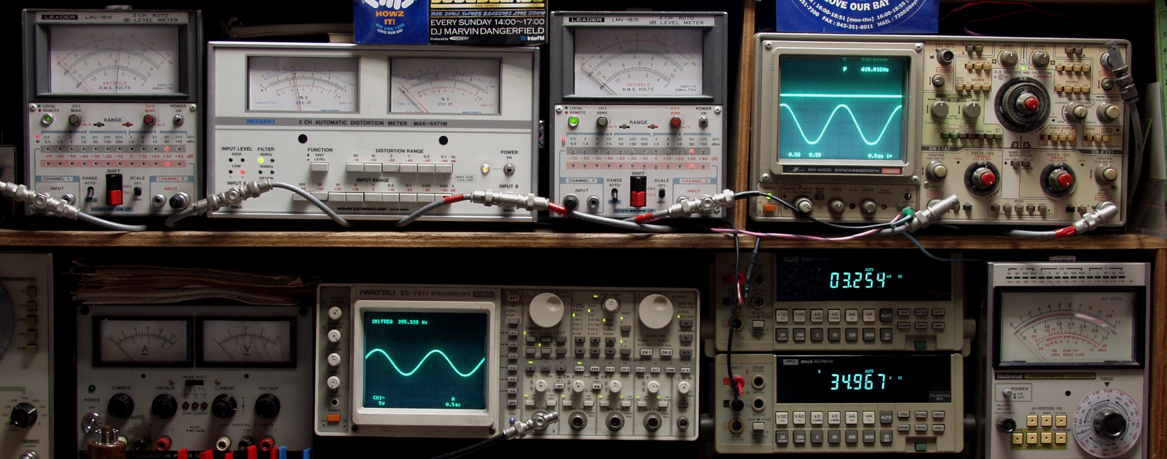| AE. バラック修理後の新品購入真空管による測定 AE1. 出力・歪み率測定 <見方> 下段左端 オーディオ発振器より400HZ・1KHZの信号を出し(歪み率=約0.003%)これをAMPに入力し、出力を測定 下段中左 オシロ=入力波形(オーディオ発振器のTTLレベル) 下段中右上=周波数計 上段左端 電圧計=L側出力電圧測定、黒針のみ使用 上段中左 歪み率計=出力の歪み率測定 左メータ=L出力、右メータ=R出力 上段中右 電圧計=R側出力電圧測定、赤針のみ使用 上段右端 オシロ=出力波形 上=R出力、下=L出力(実際にはRL電圧計の出力「Max1V」を観測) 下段中右上 デジタル電圧計=R出力電圧測定 下段中右下 デジタル電圧計=L出力電圧測定 |