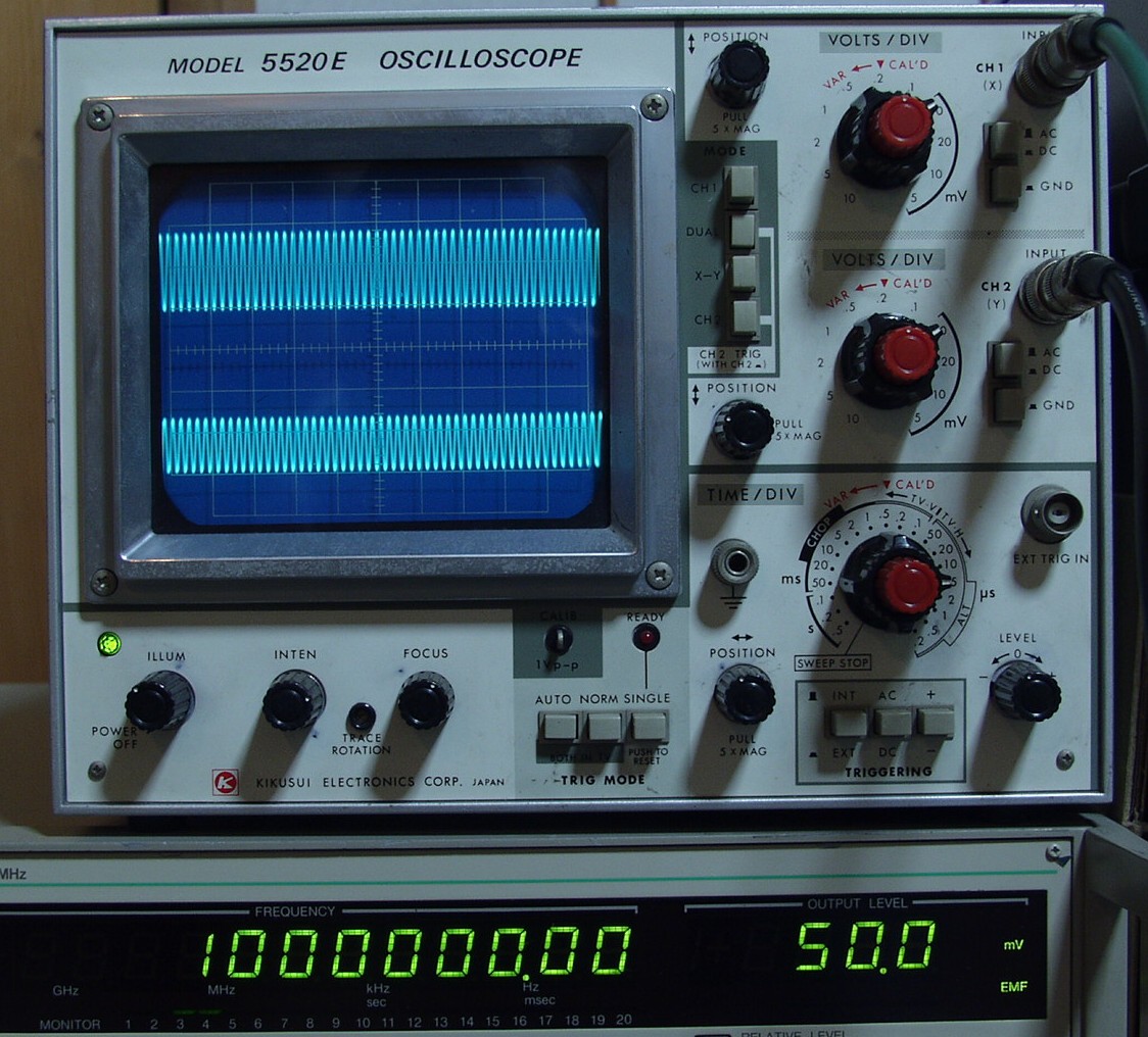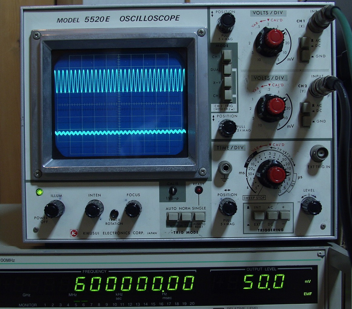 E−1. ネットワークアナライザーが無いので、下のSGより信号を入れ同時に上のオシロに入力