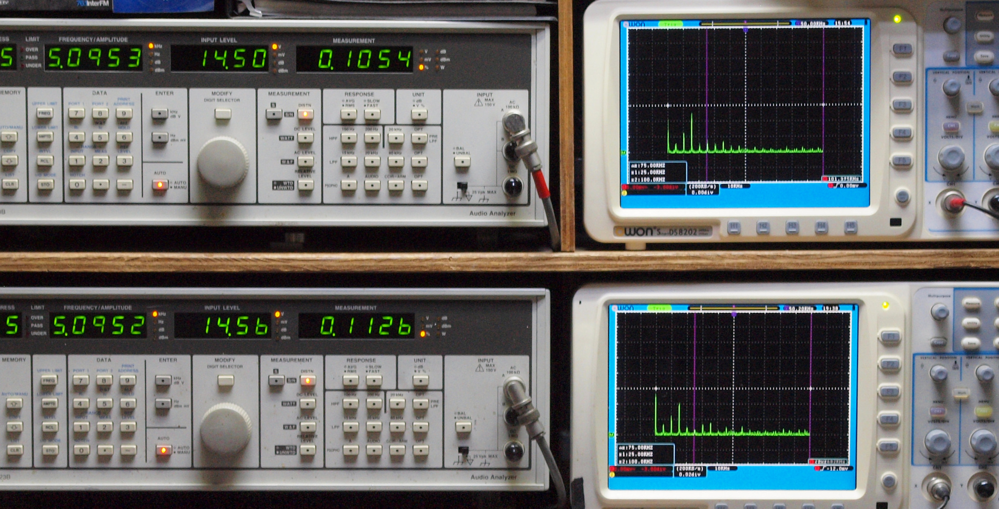 | E. 測定・調整。 画像をクリックすると、大きく(横幅2050ドット)表示されます。 E0. 出力・歪み率測定・調整 「見方」。 上段中 右側SP出力を「Audio Analyzer Panasonic VP−7723B」により測定。 表示LED、 左端=メモリーNo、 中左=周波数測定、 中右=出力電圧測定、 右端=歪み率測定。 上段右端 VP−7723Bの基本波除去出力を「owon SDS8202(200MHZ)」で「FFT分析」表示。 下段中 左側SP出力を「Audio Analyzer Panasonic VP−7723B」により測定。 表示LED、 左端=メモリーNo、 中左=周波数測定、 中右=出力電圧測定、 右端=歪み率測定。 下段右端 VP−7723Bの基本波除去出力を「owon SDS6062(200MHZ)」で「FFT分析」表示。 下段左端 オーディオ発振器 VP−7201A より50Hz〜100kHzの信号を出し(歪み率=約0.003%)、ATT+分配器を通し、AMPに入力。 よって、ダイアル設定出力レベルより低くなります。測定機器の仕様や整備の様子はこちら、「VP−7723B」「VP−7201A」。 FFT画面の見方はこちら。 |