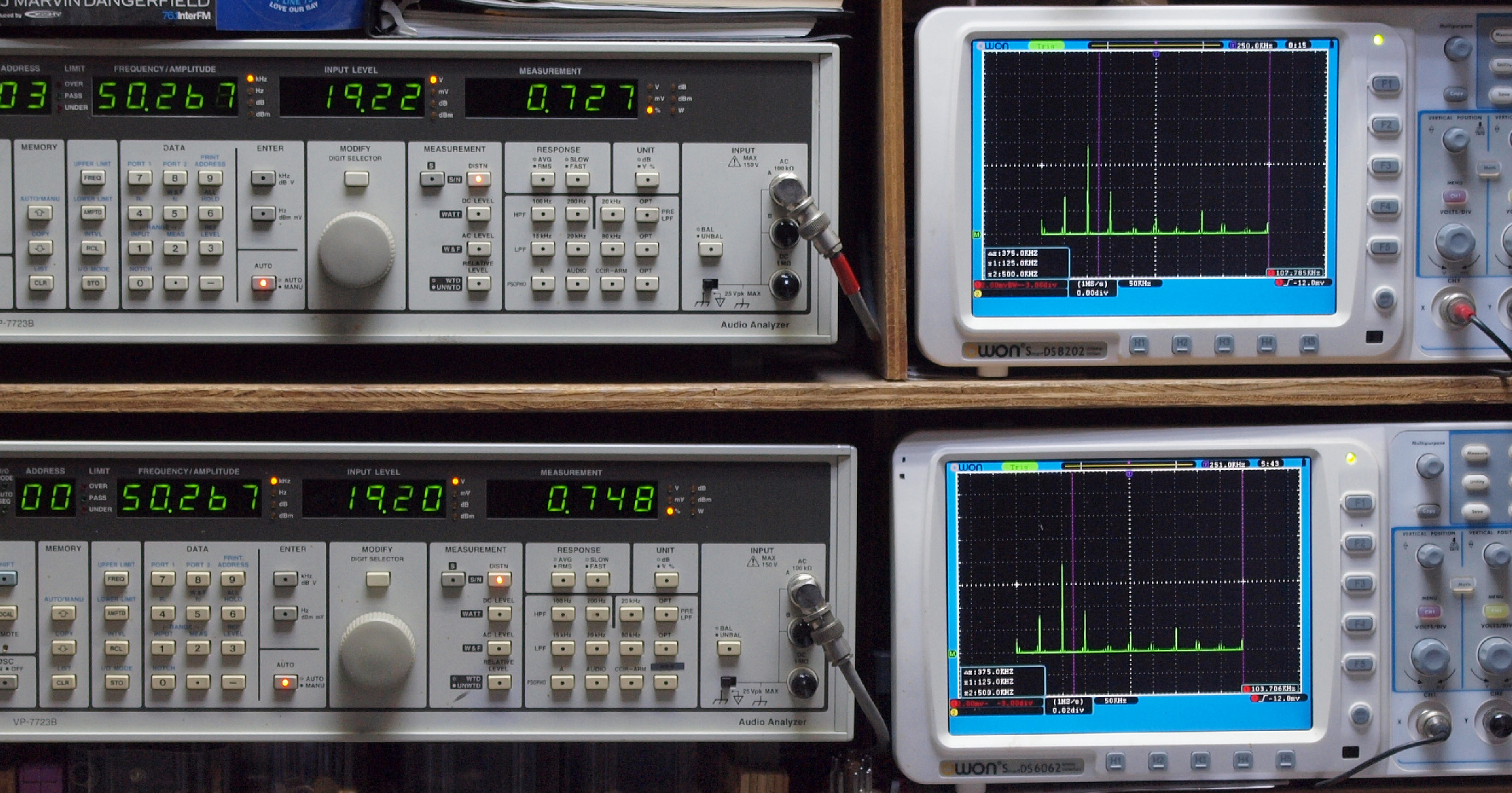 | E. 測定・調整 E1. 出力・歪み率測定・調整 「見方」。 上段中 右側SP出力を「Audio Analyzer Panasonic VP−7723B」により測定。 表示LED、 左端=メモリーNo、 中左=周波数測定、 中右=出力電圧測定、 右端=歪み率測定。 上段右端 VP−7723Bの基本波除去出力を「owon SDS8202(200MHZ)」で「FFT分析」表示。 下段中 左側SP出力を「Audio Analyzer Panasonic VP−7723B」により測定。 表示LED、 左端=メモリーNo、 中左=周波数測定、 中右=出力電圧測定、 右端=歪み率測定。 下段右端 VP−7723Bの基本波除去出力を「owon SDS6062(200MHZ)」で「FFT分析」表示。 下段左端 オーディオ発振器 VP−7201A より50Hz〜100kHzの信号を出し(歪み率=約0.003%)、ATT+分配器を通し、AMPに入力。 よって、ダイアル設定出力レベルより低くなります。測定機器の仕様や整備の様子はこちら、「VP−7723B」「VP−7201A」。 FFT画面の見方はこちら。 |