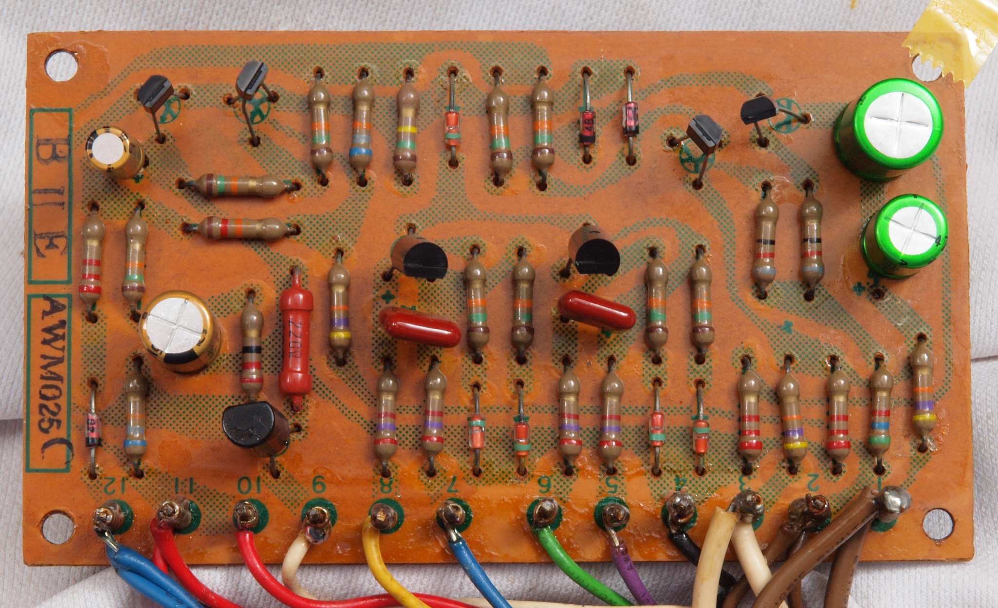 C22. 修理後 終段TR(トランジスター)基板。電解コンデンサー8個、半固定VR4個、TR(トランジスター)4個交換。
