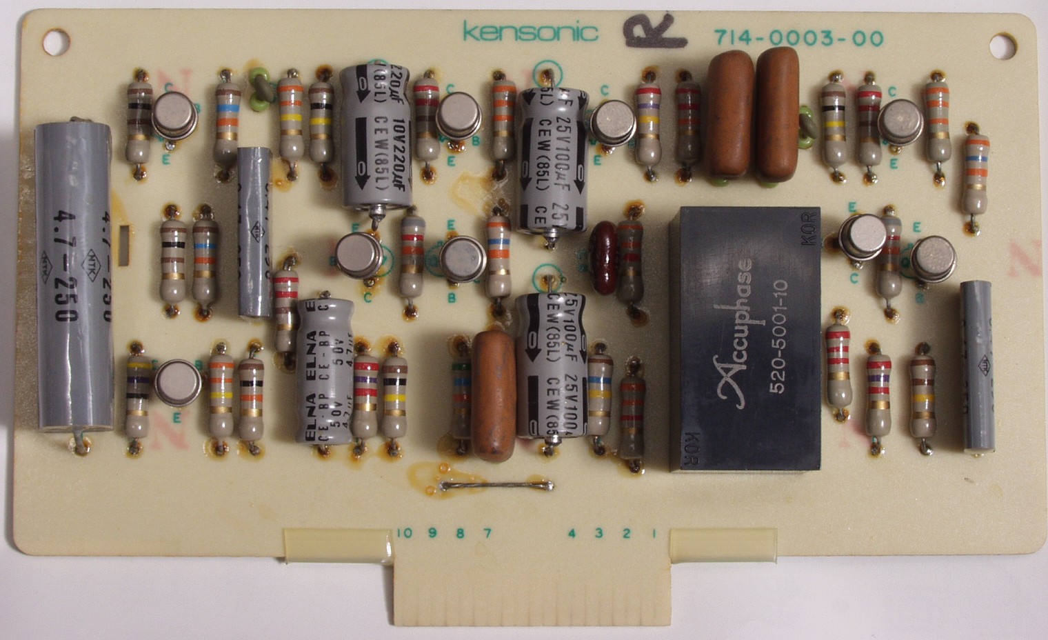 | C72. 修理後 R出力AMP基板 電解コンデンサー4個、フイルムコンデンサー4個、TR(トランジスタ−)9個交換 |