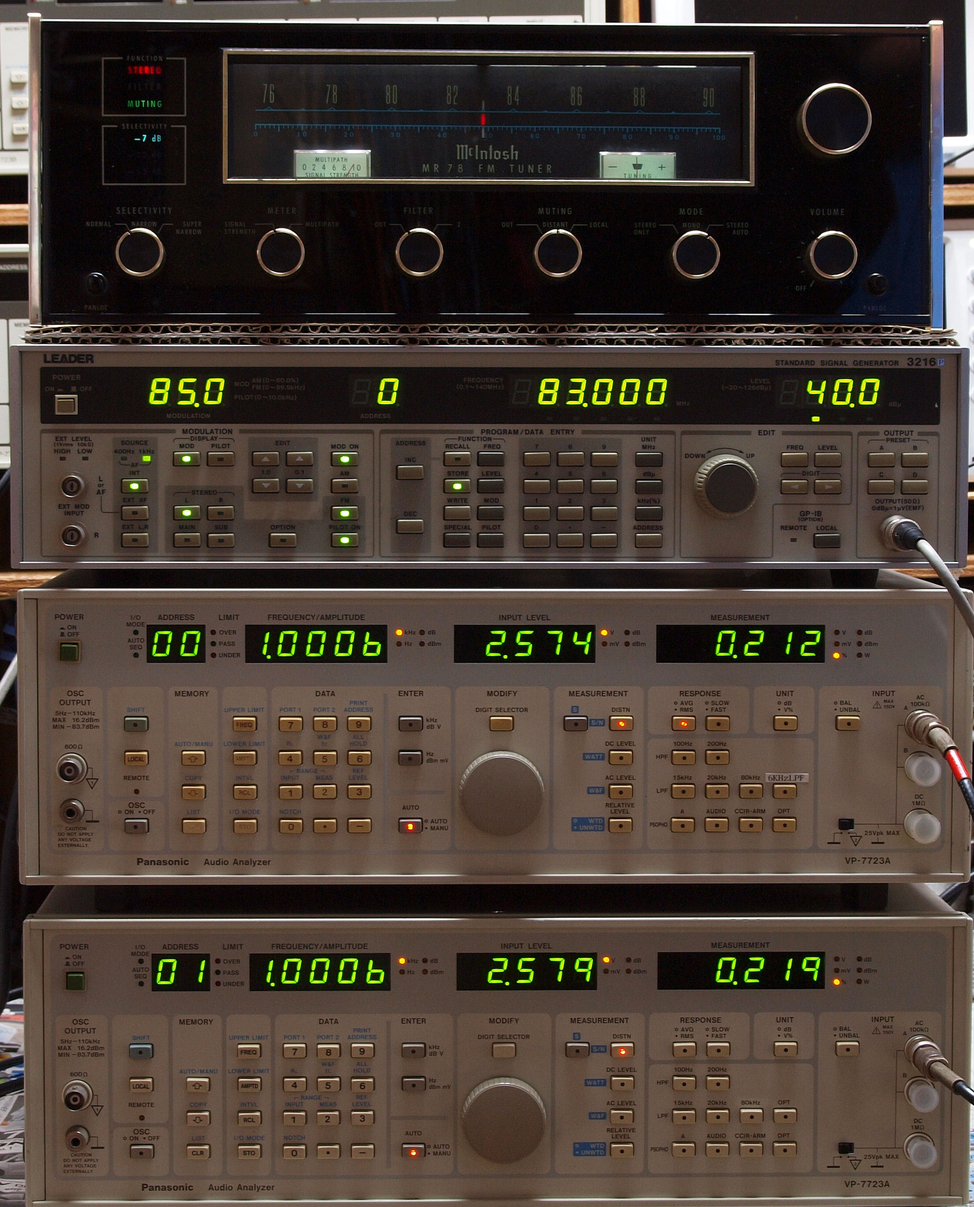 | E. 調整・測定、 FM受信感度、RL分離測定調整. <見方> 上の「LEADER 3216P FM ステレオ信号発信器」より信号を出す。 これを受信し出力を測定する。 表示LED、 左端=変調度、 中左=メモリNo、 中右=出力周波数、 右端=出力レベル。 中=R出力測定。 「Audio Analyzer Panasonic VP−7723A」より測定。 表示LED、 左端=メモリーNo、 中左=周波数測定、 中右=出力電圧測定、 右端=歪み率測定。 下=L出力測定。 「Audio Analyzer Panasonic VP−7723A」より測定。 表示LED、 左端=メモリーNo、 中左=周波数測定、 中右=出力電圧測定、 右端=歪み率測定。 |