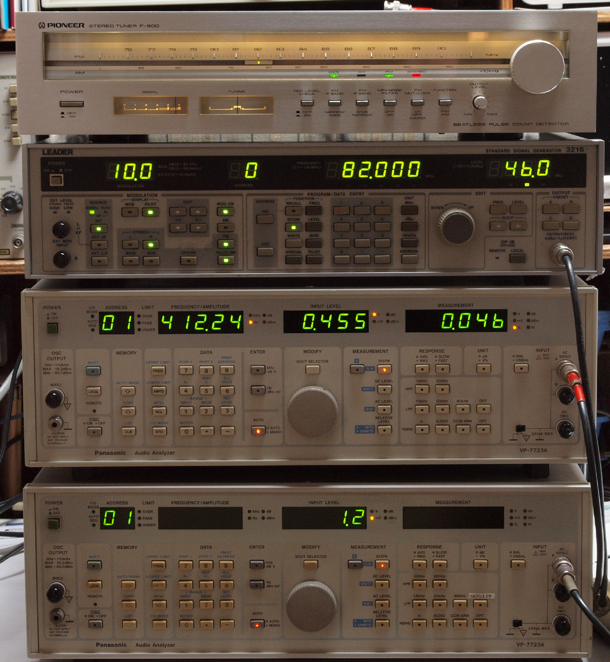 | E. 調整・測定、 受信感度、FM−RL分離測定調整. <見方> 中上の「LEADER 3216P AM・FMステレオ信号発信器」より信号を出す。これを受信し出力を測定する。 表示LED、 左端=変調度、 中左=メモリNo、 中右=出力周波数、 右端=出力レベル。 中下=R出力測定。 「Audio Analyzer Panasonic VP−7723B」より測定。 表示LED、 左端=メモリーNo、中左=周波数測定、中右=出力電圧測定、右端=歪み率測定。 下=L出力測定。 「Audio Analyzer Panasonic VP−7723B」より測定。 表示LED、 左端=メモリーNo、中左=周波数測定、中右=出力電圧測定、右端=歪み率測定。 |