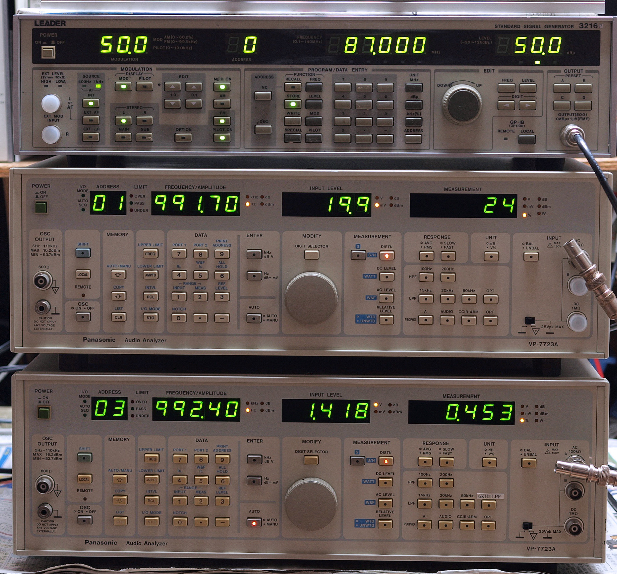 | E. 調整・測定、 FM受信感度、RL分離測定調整。画像をクリックすると、大きく(横幅2050ドット)表示されます。 <見方> 中上の「LEADER 3216P FM ステレオ信号発信器」より信号を出す。 これを受信し出力を測定する。 表示LED、 左端=変調度、 中左=メモリNo、 中右=出力周波数、 右端=出力レベル。 中下=R出力測定。 「Audio Analyzer Panasonic VP−7723B」より測定。 表示LED、 左端=メモリーNo、 中左=周波数測定、 中右=出力電圧測定、 右端=歪み率測定。 下=L出力測定。 「Audio Analyzer Panasonic VP−7723B」より測定。 表示LED、 左端=メモリーNo、 中左=周波数測定、 中右=出力電圧測定、 右端=歪み率測定。 |