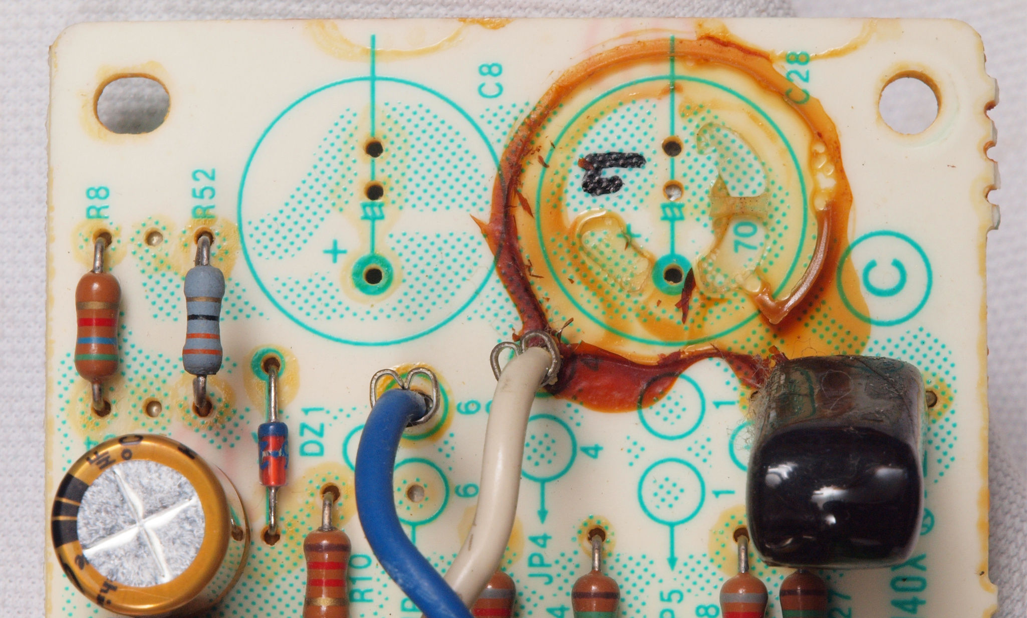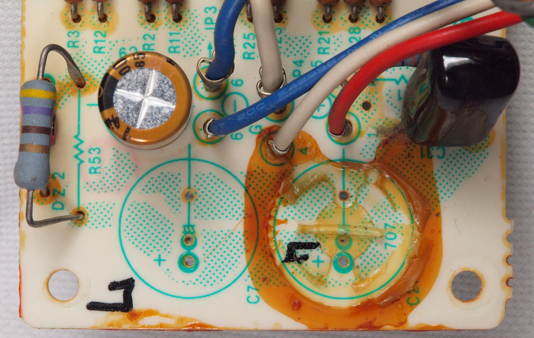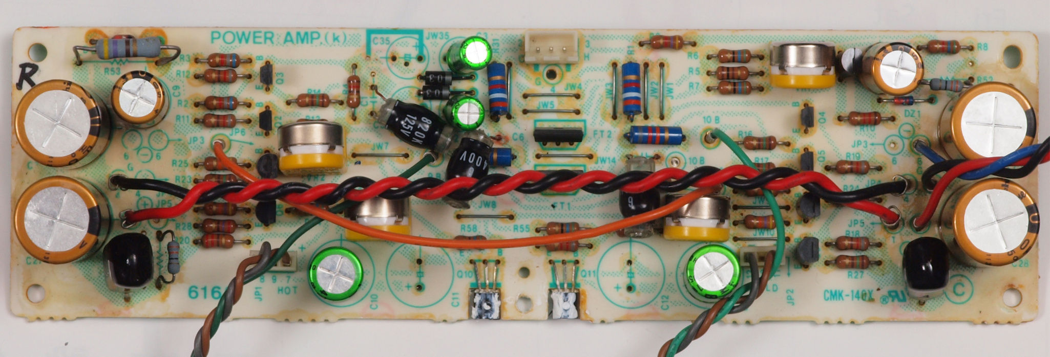 | C414. 修理前 R側AMP基板。 電解コンデンサー固定用の接着材2、当時は溶媒にトルエンが使用されており、銅を腐食する。 | ||||||||||||||||||||||||||||||||||||||||||||||||||||