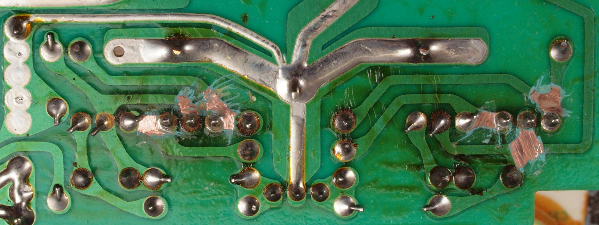 | C634. 修理後 L側ドライブ基板裏。 ドライブTR(トランジスター)の足の銅箔を広げる。 | ||||||||||||||||||||||||||||||||||||||||||||||||||||