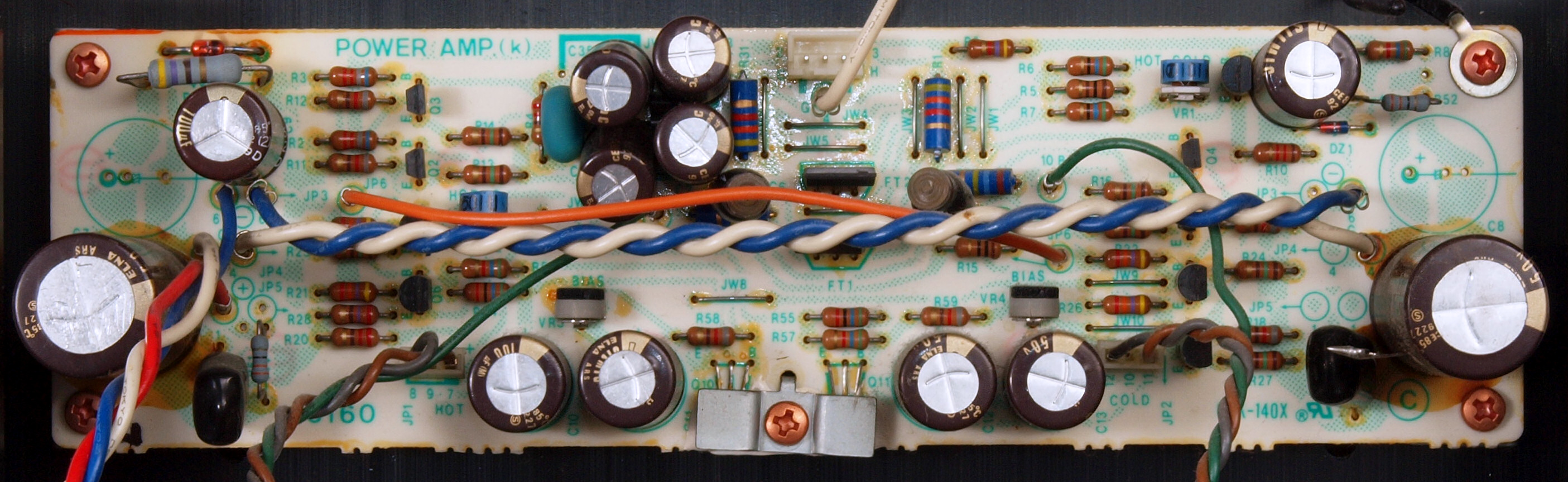 | C262. 修理前 R側・ドライブAMP基板、電解コンデンサー固定用の接着材、当時は溶媒にトルエンが使用されており、銅を腐食する。 | ||||||||||||||||||||||||||||||||||||||||||||||||