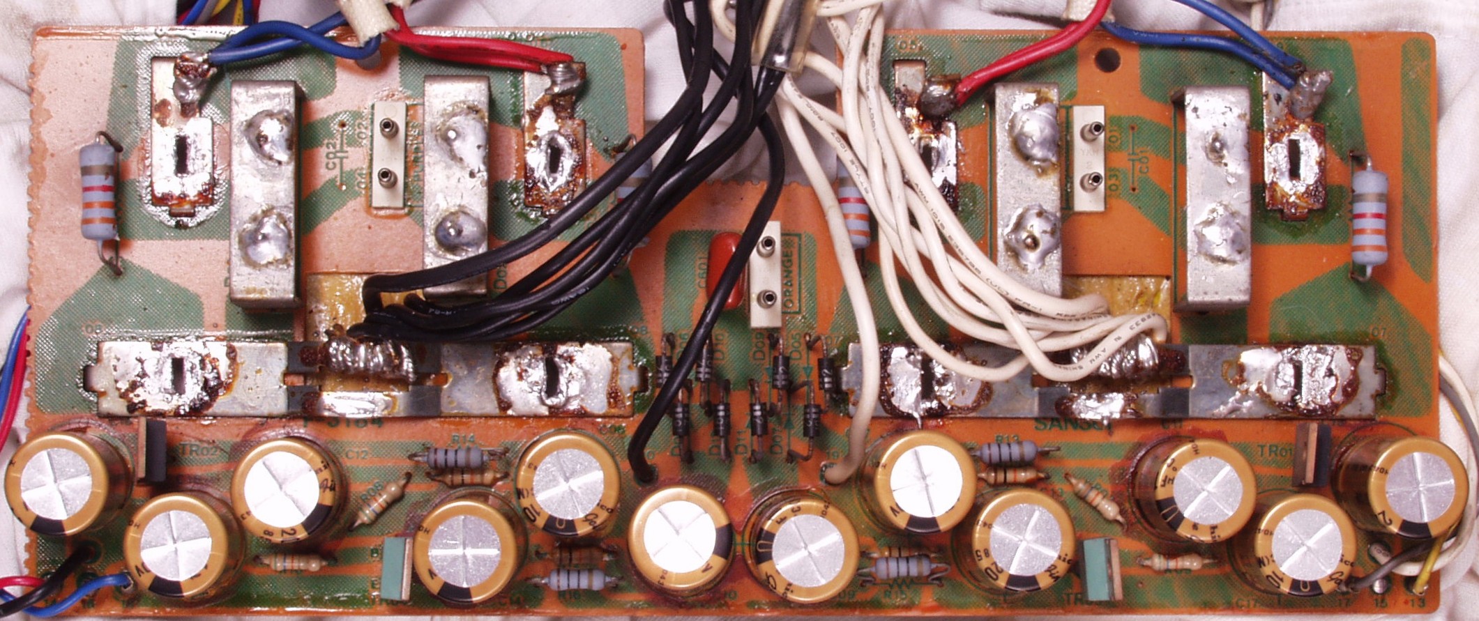 初段FET(電界効果トランジスター)2個、半固定VR4個、電解コンデンサ−20個、抵抗6個、TR(トランジスター)6個交換