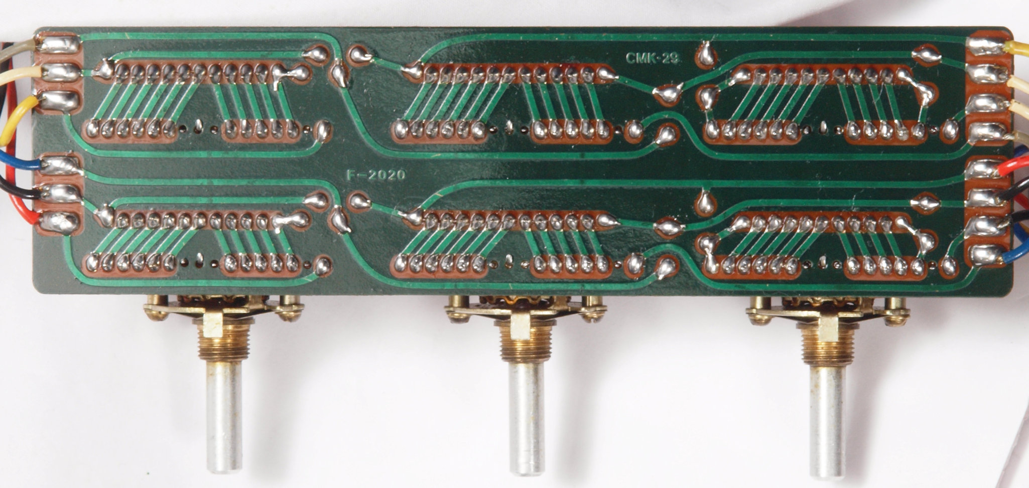 | CJ4. 完成TAPE1入力VR、TEAP2入力VR,AUX入力VR基板裏。 全ての半田をやり直して洗浄し、コート液を塗布。 | ||||||||||||||||||||||||||||||||||||||||||