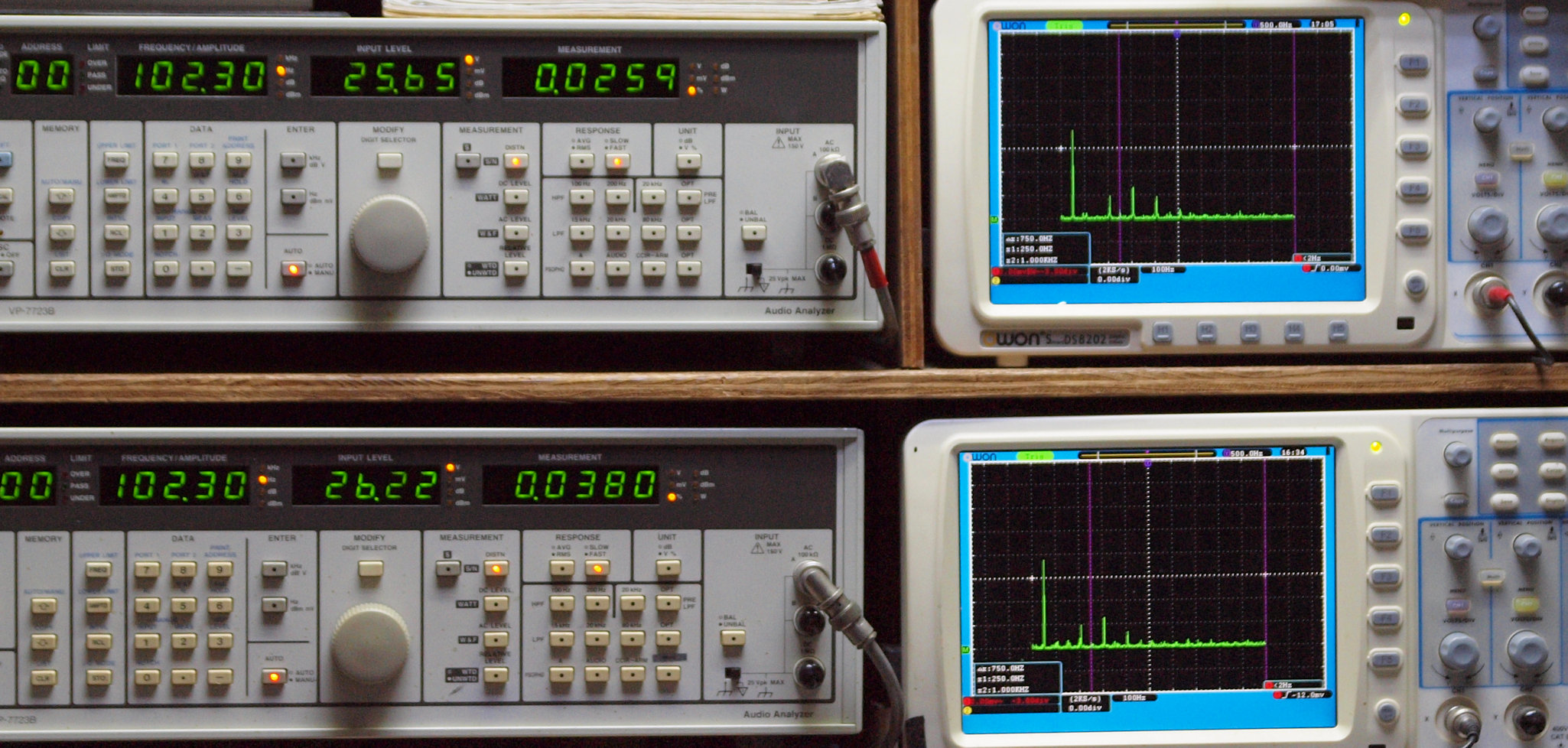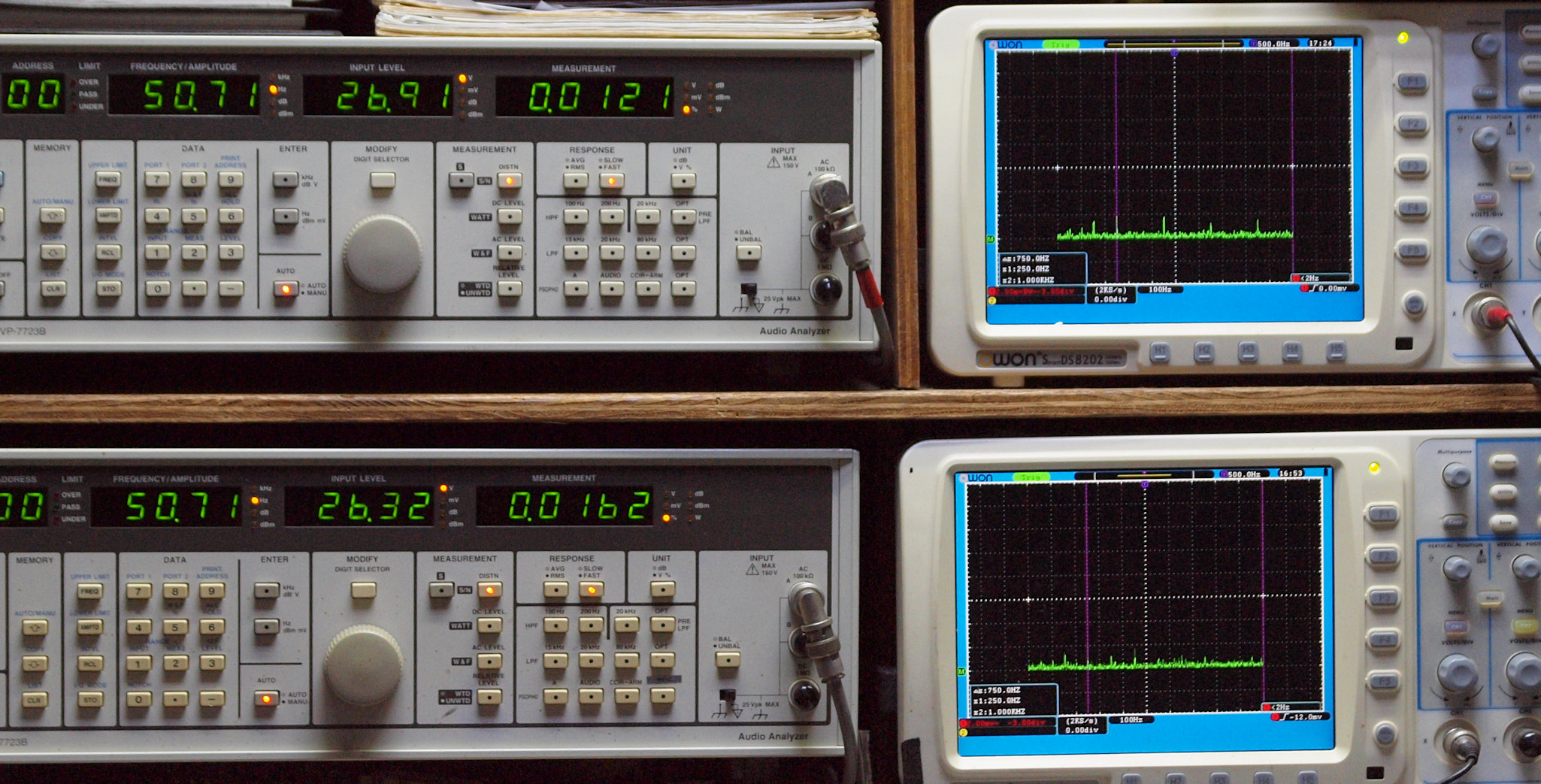 | E. 測定・調整。 画像をクリックすると、大きく(横幅2050ドット)表示されます。 E0. 出力・歪み率測定・調整 「見方」。 上段中 右側SP出力を「Audio Analyzer Panasonic VP−7723B」により測定。 表示LED、 左端=メモリーNo、 中左=周波数測定、 中右=出力電圧測定、 右端=歪み率測定。 上段右端 VP−7723Bの基本波除去出力を「owon SDS8202(200MHZ)」で「FFT分析」表示。 下段中 左側SP出力を「Audio Analyzer Panasonic VP−7723B」により測定。 表示LED、 左端=メモリーNo、 中左=周波数測定、 中右=出力電圧測定、 右端=歪み率測定。 下段右端 VP−7723Bの基本波除去出力を「owon SDS6062(200MHZ)」で「FFT分析」表示。 下段左端 オーディオ発振器 VP−7201A より50Hz〜100kHzの信号を出し(歪み率=約0.003%)、ATT+分配器を通し、AMPに入力。 よって、ダイアル設定出力レベルより低くなります。測定機器の仕様や整備の様子はこちら、「VP−7723B」「VP−7201A」。 FFT画面の見方はこちら。 |