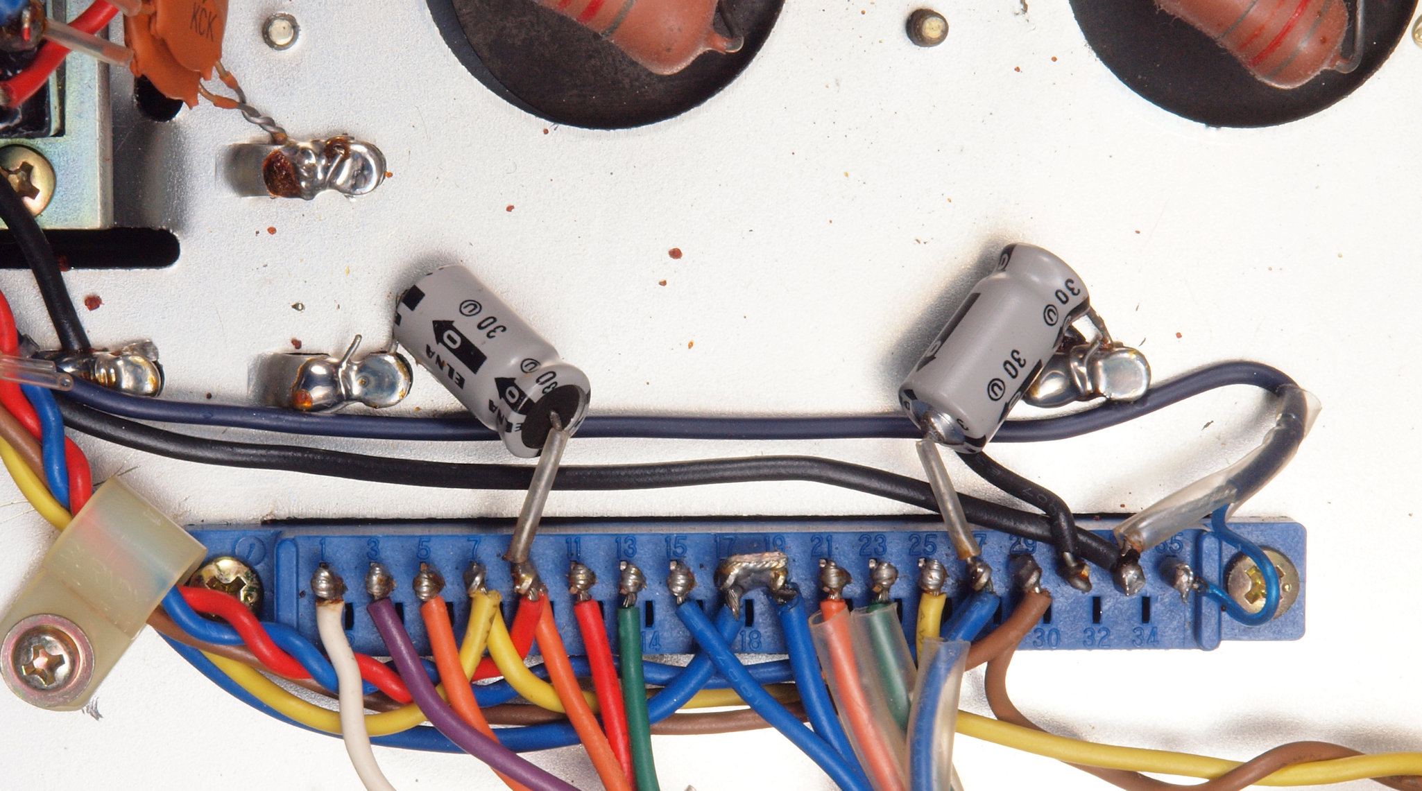 | CH2. 修理後 R側終段基板コネクタ下電解コンデンサー。電解コンデンサー2個交換。 | ||||||||||||||||||||||||||||||||||||||||||